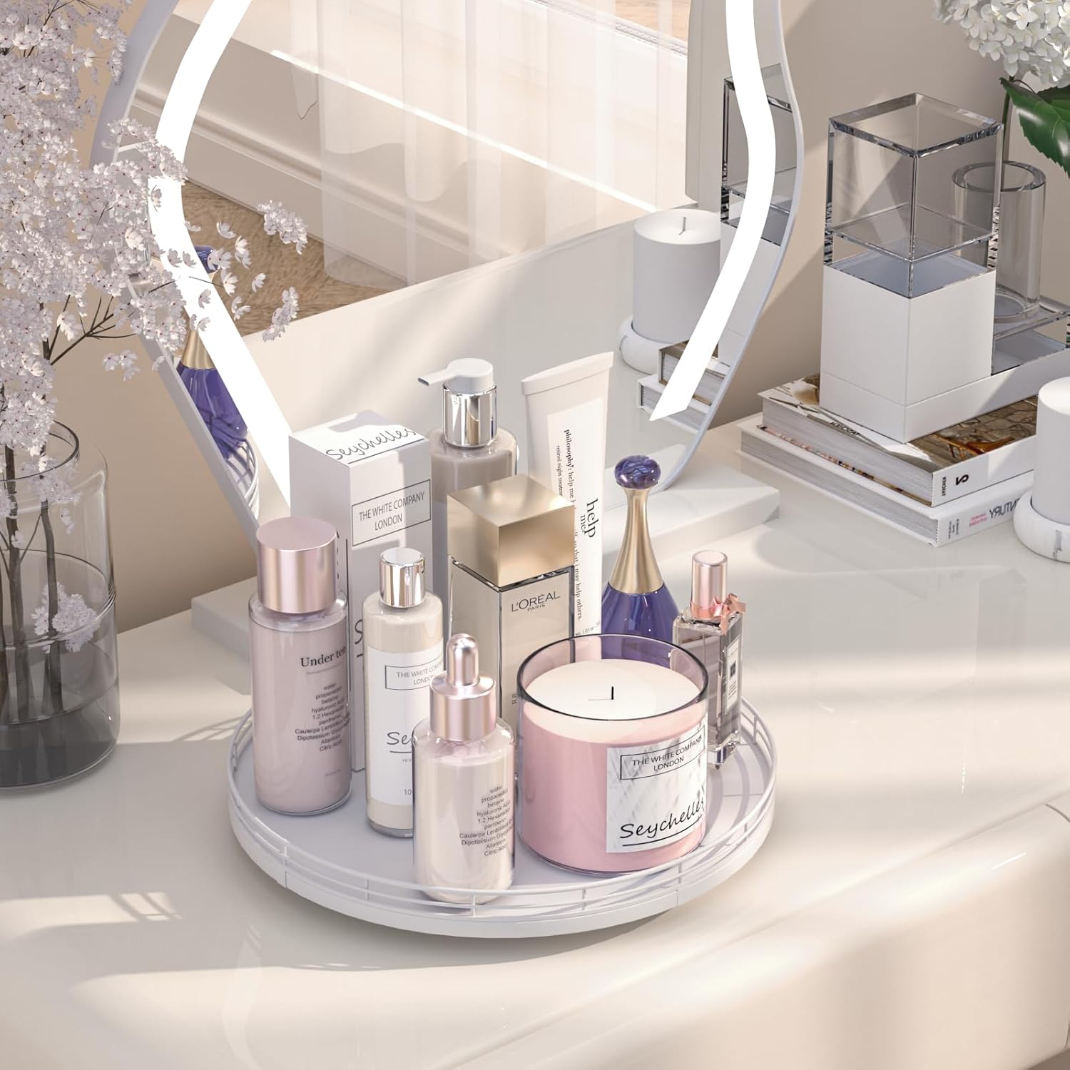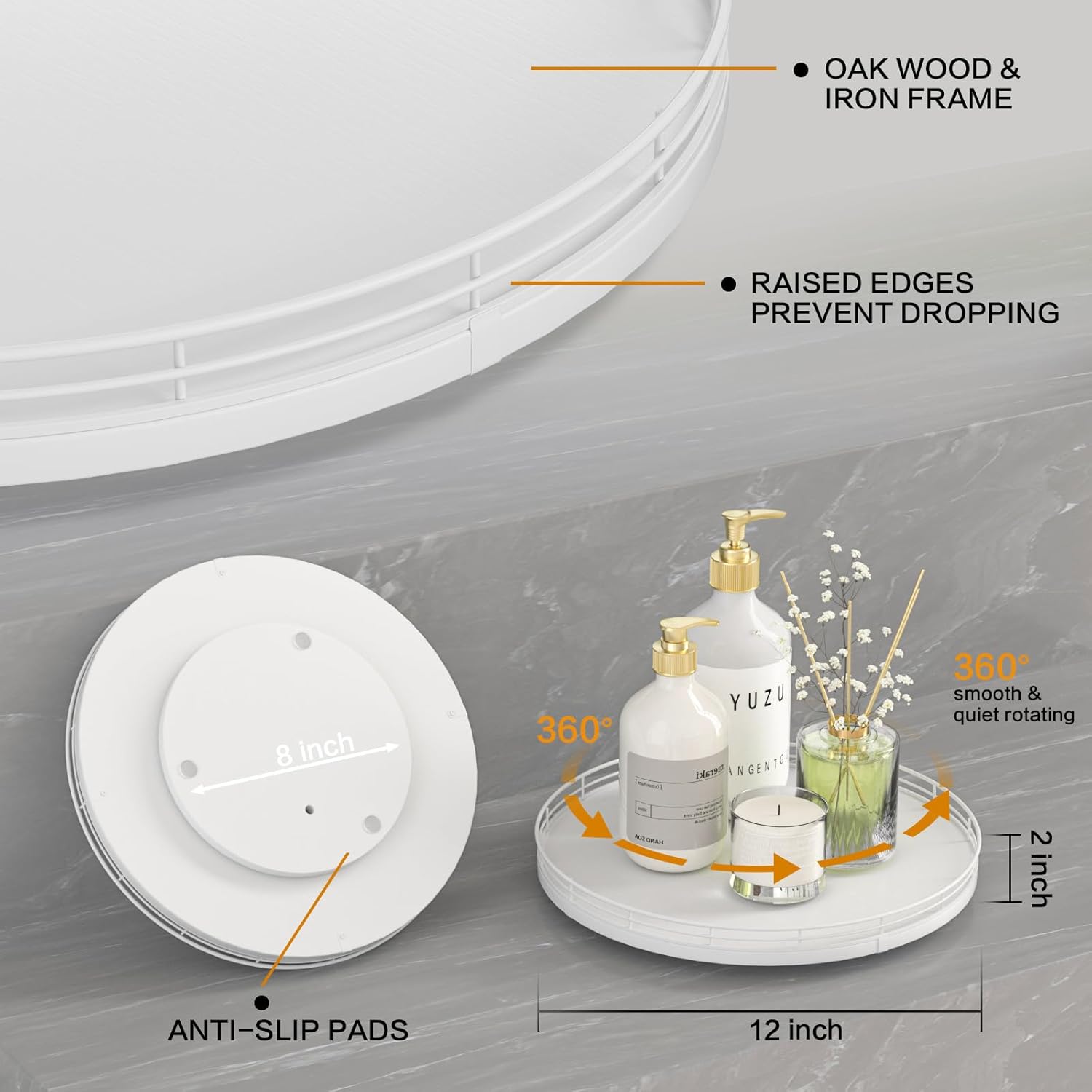 - ๐ง๐ต๐ผ๐๐ด๐ต๐๐ณ๐๐น ๐๐ฒ๐๐ถ๐ด๐ป: The turntable tray features a smooth and silent 360ยฐrotation; Bottom slip-resistant pads for stability and protect your countertop from scratches; Raised edges on each organizer tray to keep items from falling out; Easy to use, no installation required