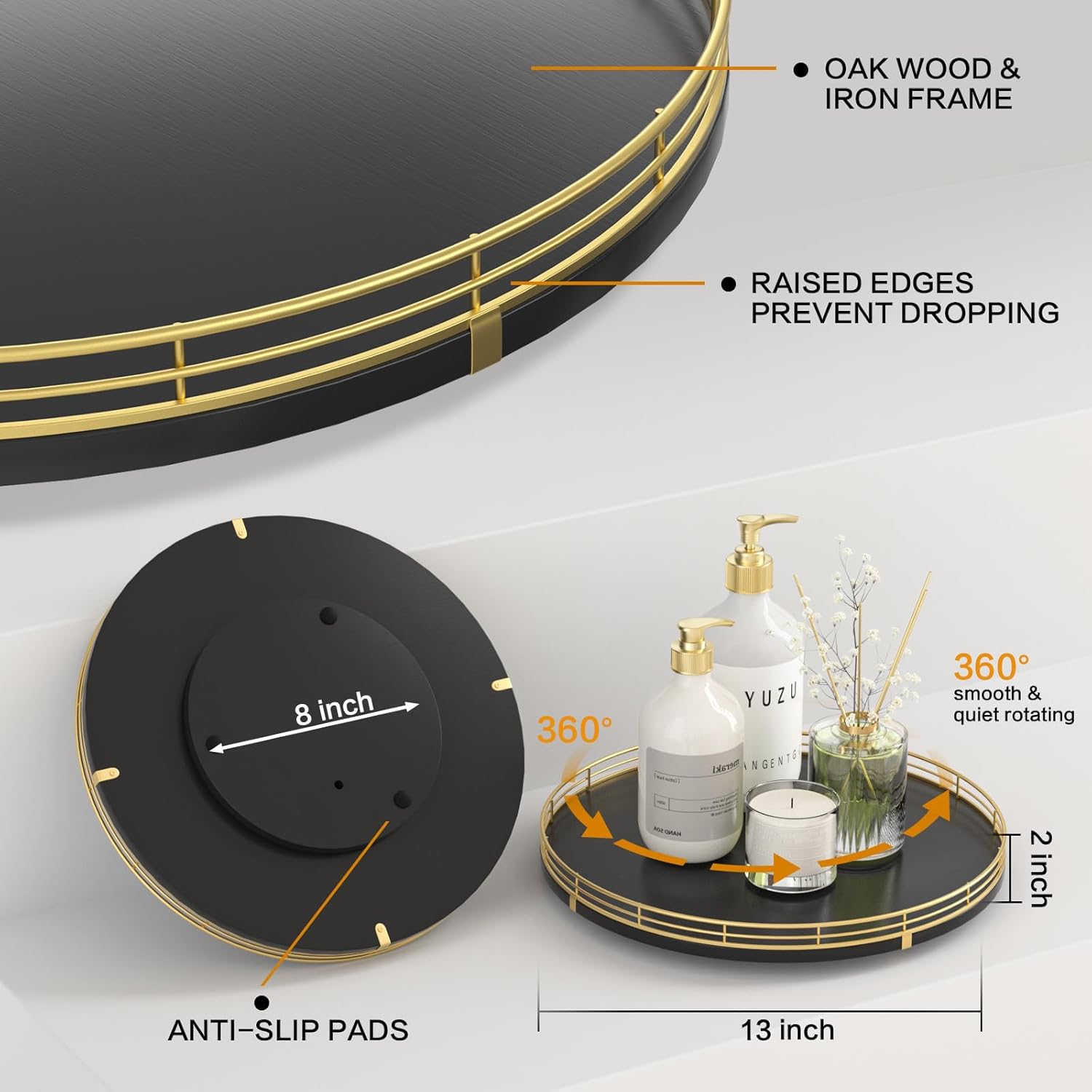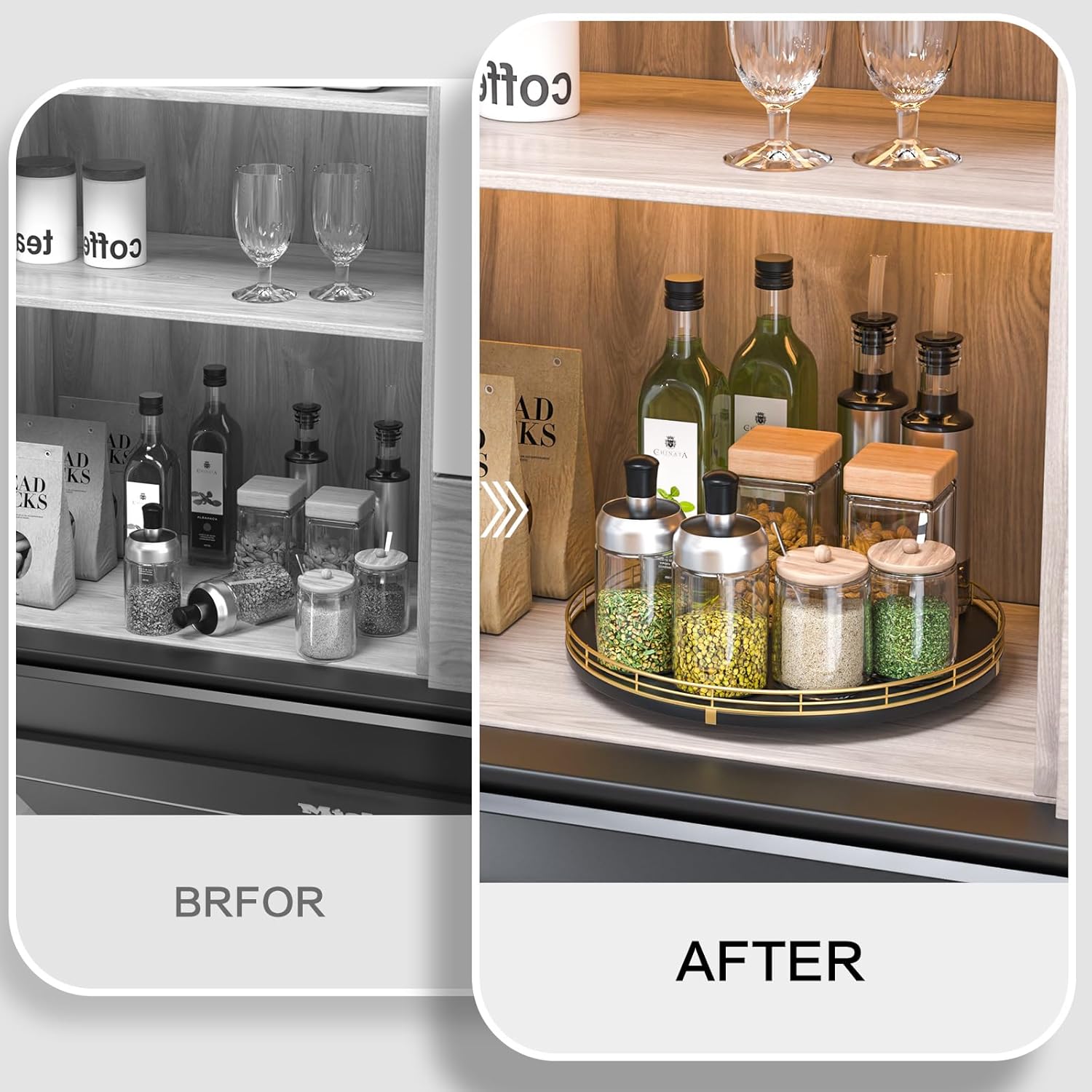 - ๐ง๐ต๐ผ๐๐ด๐ต๐๐ณ๐๐น ๐๐ฒ๐๐ถ๐ด๐ป: The turntable tray features a smooth and silent 360ยฐrotation; Bottom slip-resistant pads for stability and protect your countertop from scratches; Raised edges on each organizer tray to keep items from falling out; Easy to use, no installation required