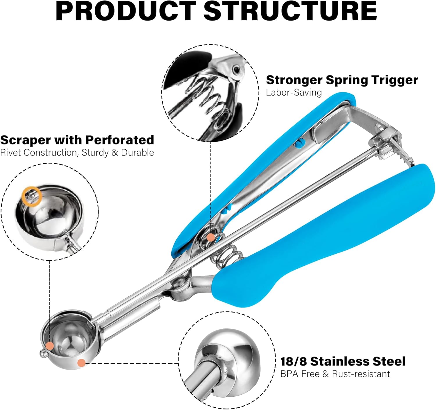 - đšăLooking for New Kitchen Gadgets?ă Here's a effortless scoop you won't want to miss! Featuring an innovative gear ratchet release system, the ice cream scoop with Trigger Release is perfect for taking the pressure off your wrist and hand when in use, it makes scooping food a breeze! The handle fits your hands comfortably, just squeeze the handle gently and the scoop scraper bar can quickly releases the food neatly.