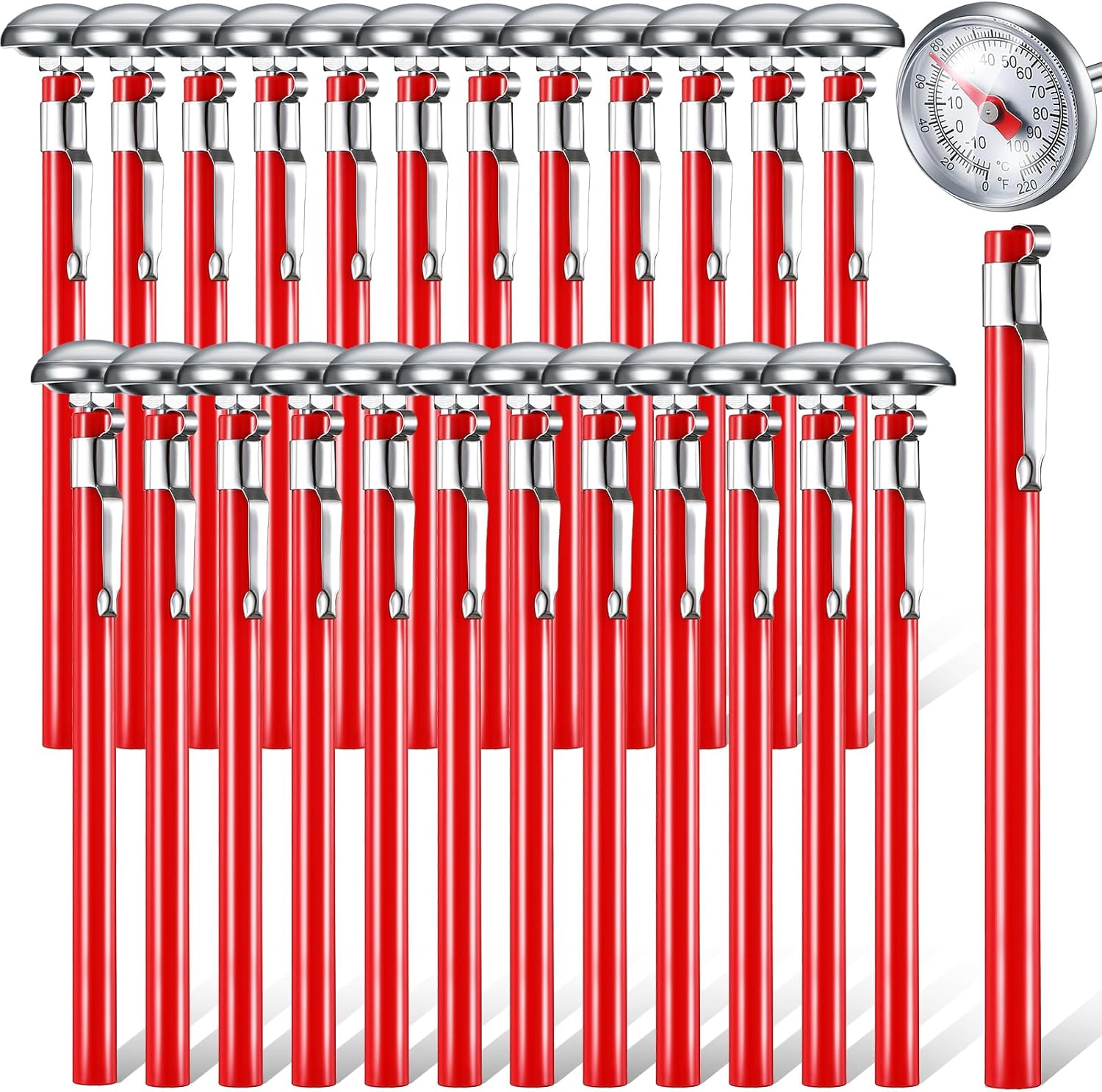 Xuhal 24 Pcs Stainless Steel Kitchen Thermometer with 5 Inch Long Stem 1 Inch Dial Thermometer Milk Frothing Food for Oven Probe Meat Grill BBQ Cooking Chocolate Water (Red)