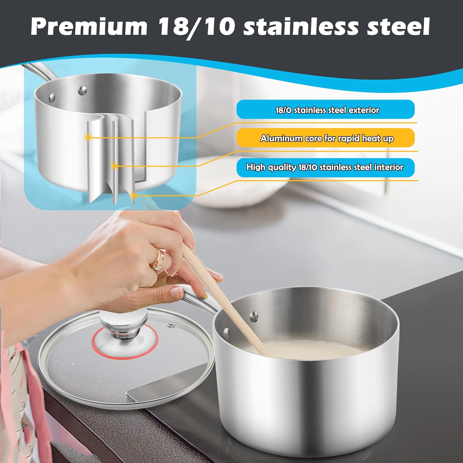 E-far 3-Quart Saucepan, Tri-Ply Stainless Steel Sauce Pan with Glass Lid, Small Cooking Induction Pot Compatible with All Cooktops, Non Toxic, Oven & Dishwasher Safe