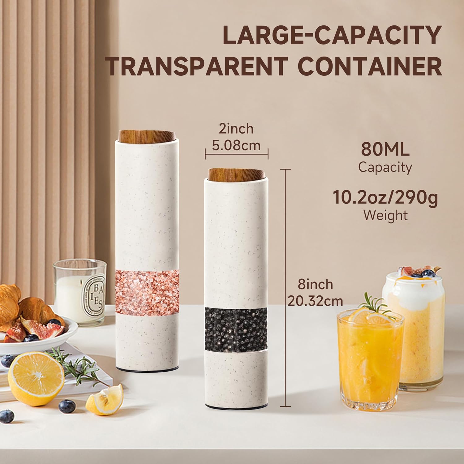 - 🧂🥓【Automatic Operation】Our salt and pepper grinder set battery operated adopts advanced sensing design, No need manual grinding, no buttons to press.Simply flipped the grinder and you will have fresh ground spices. Allows you to activate the distribution of your favorite spices with one hand, while the other hand is free to handle other kitchen tasks.