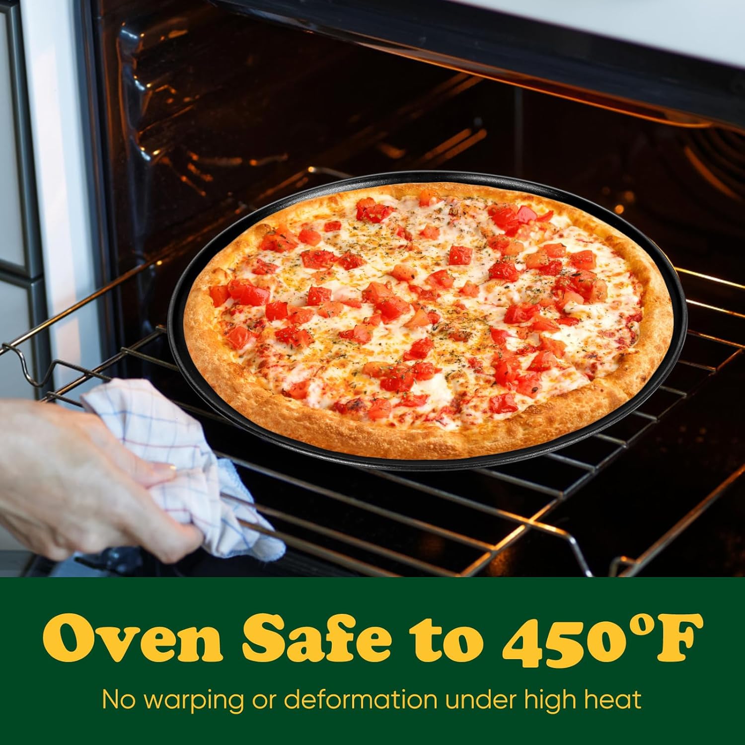 - CRAFTED - Smooth rolled rims with no sharp edges, Provides you with comfortable grasp, Slightly sloped sides for holding more toppings without messing your oven, Premium steel heats evenly with no hot spots producing perfect crispy crust