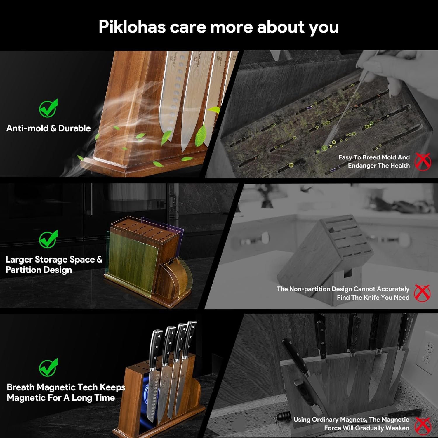 - Enduring & Excellence Sharpness: Professional, the satin-finished blade has precision cutting and is finely honed. Each knife's edge of Piklohas is hand-polished and precisely achieves 15 degrees per side for maximum sharpness, with Rockwell hardness of 58, extraordinary properties, and edge retention.