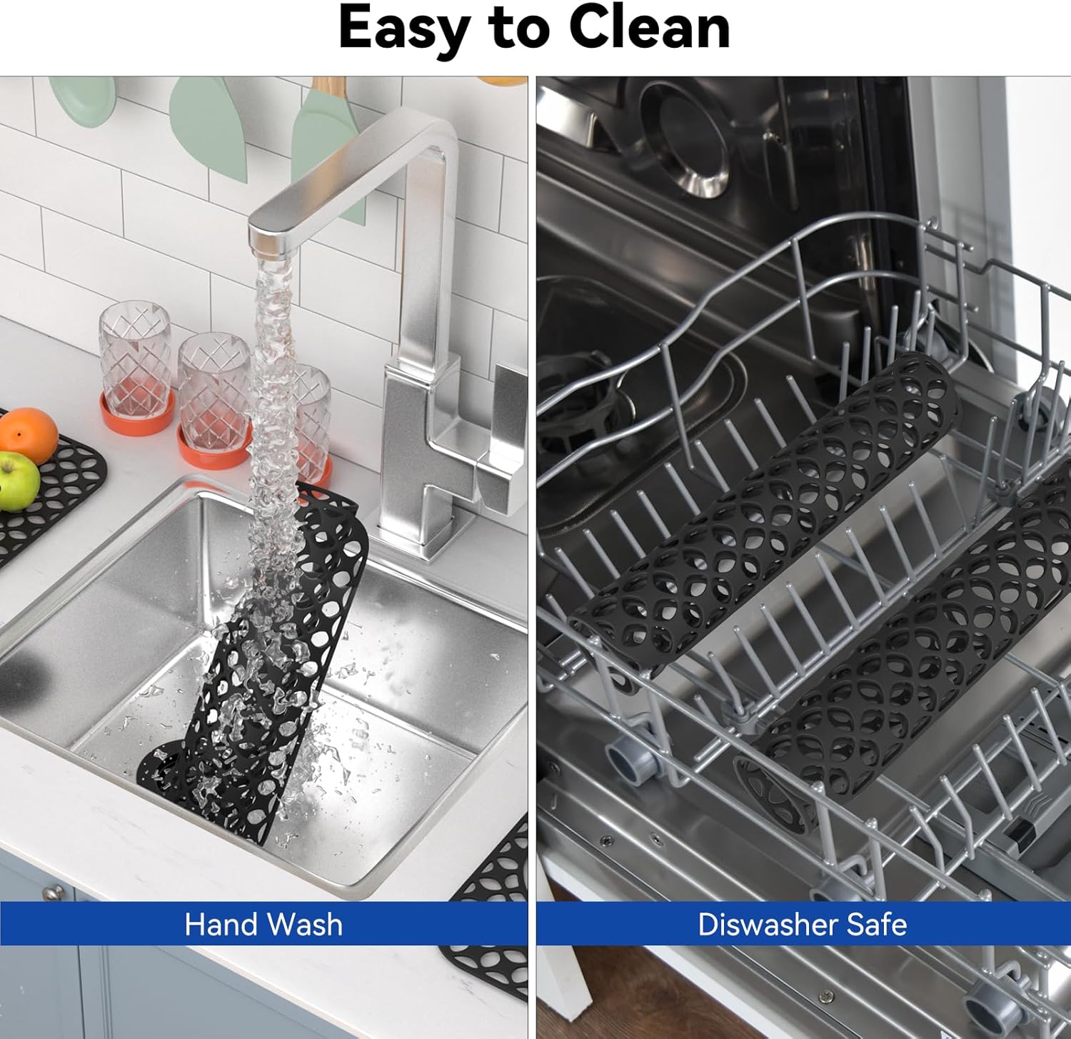 TOOVEM Kitchen Sink Mats, 2PCS Non-Slip Heat Resistant Silicone Sink Protector Mat, Folding Farmhouse Rear Drain Sink Mats (Type2: Side Drain, Black)