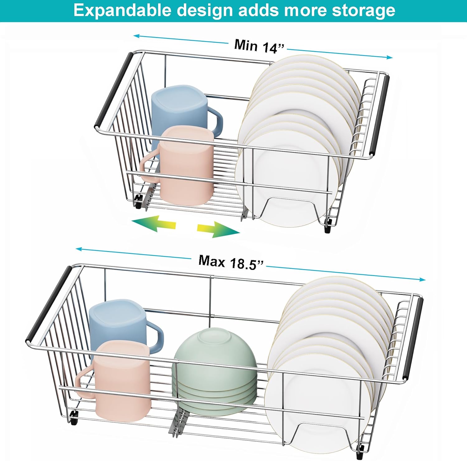 - ✔ EXTENDABLE MAIN BODY ADDS MORE STORAGE CAPACITY - Unlike other dish racks only with expandable arms, this dish drying rack comes with adjustable main body capacity, the main body can be adjusted from 14" to 18.5".