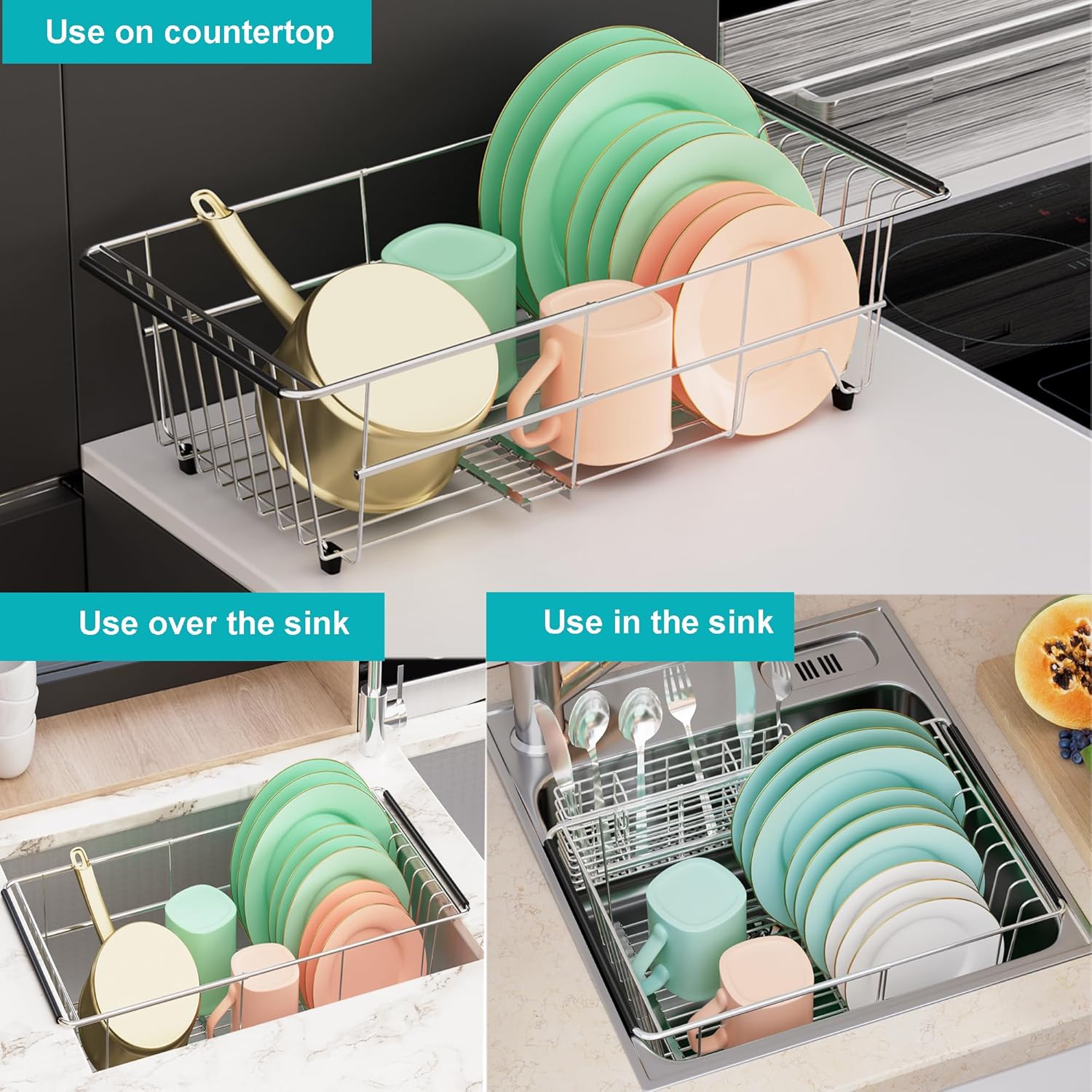 - ✔ 3-in-1 FUNCTION - This dish drying rack expands for use on the counter, in the sink or over the sink. Non slip rubber arms and feet protects the counter and sink from scratches.