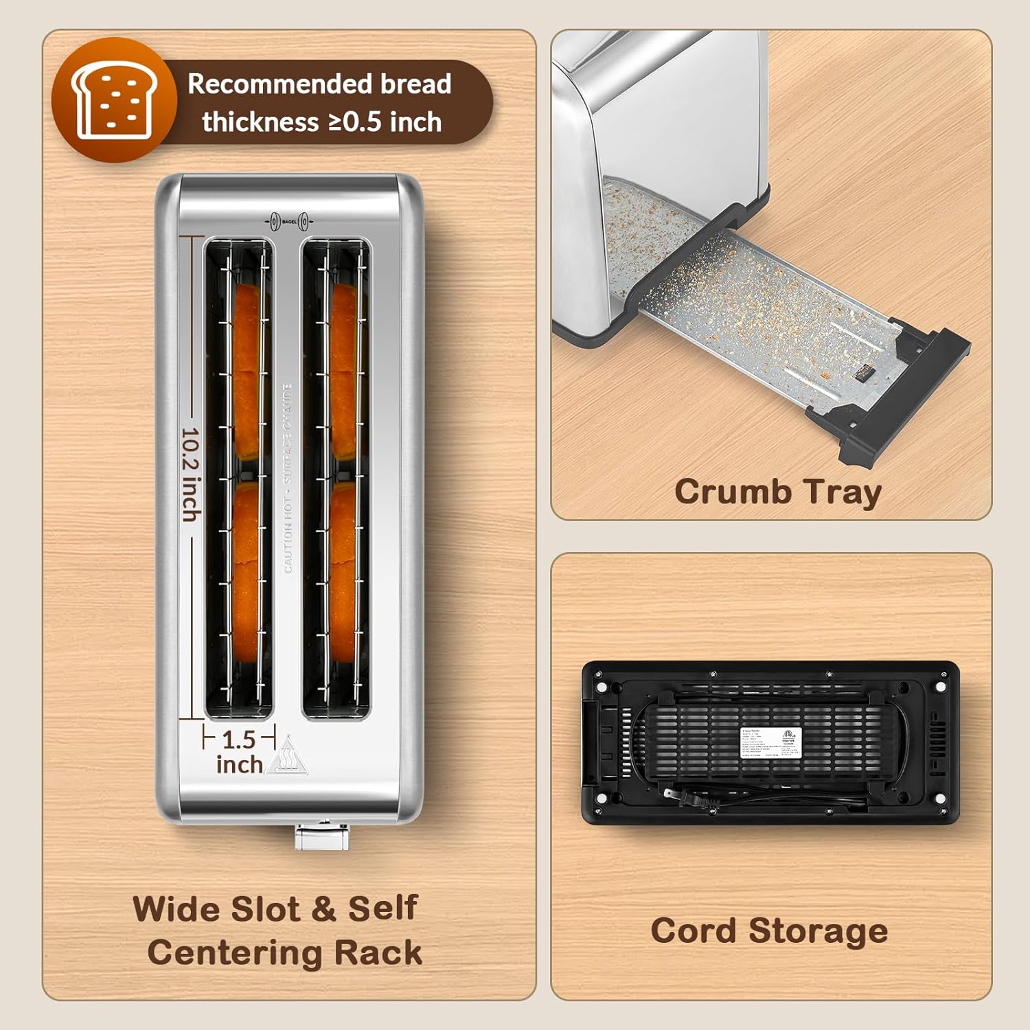 - 【Easy To Clean】: The toasting slots are made of non-stick, food-grade stainless steel, and there's a removable crumb tray at the bottom. With these features, cleaning the bread toaster requires minimal effort.