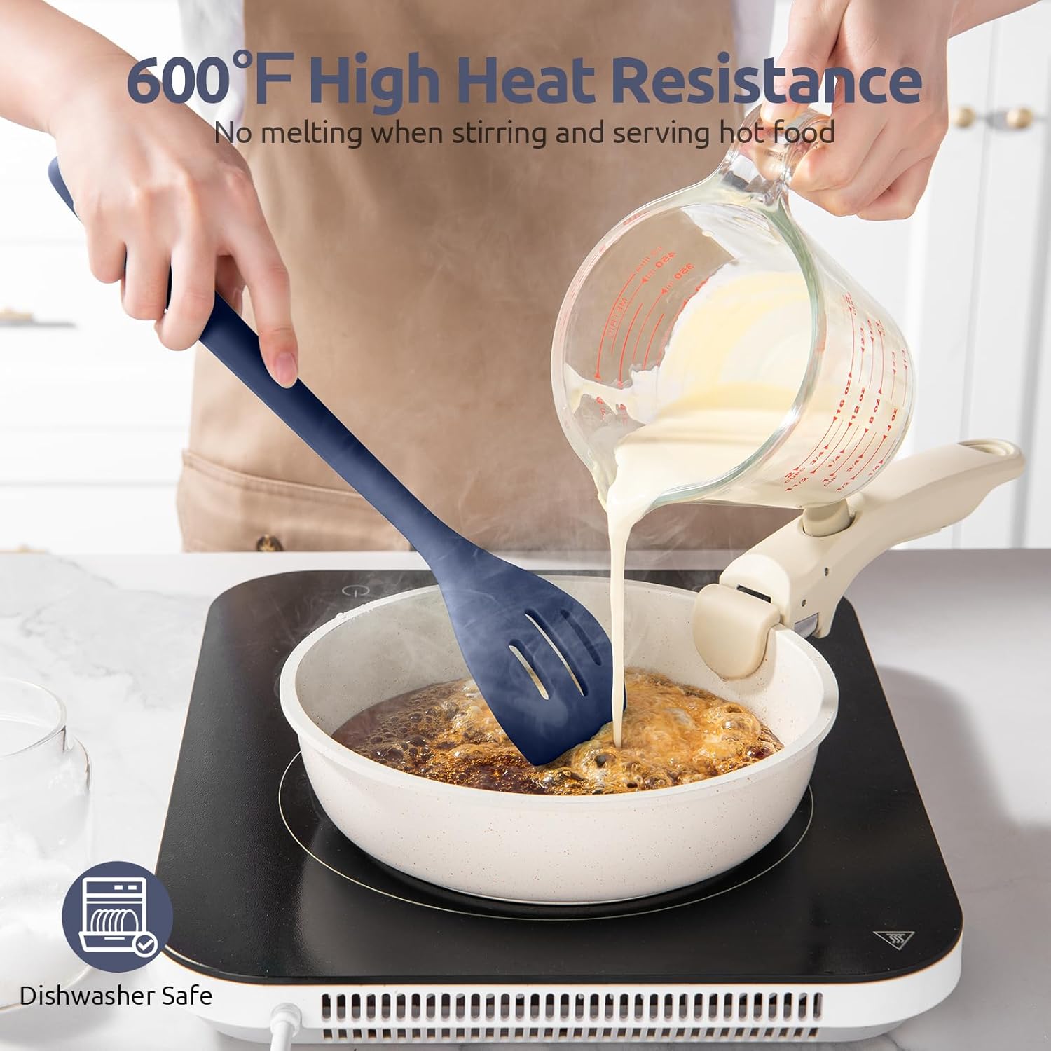 - [Scratchproof Silicone Tip Safe with Non-Stick Cookware] Using a kitchen silicon spoon is necessary so as to keep and not scratch the coating of non-stick pots and pans. These spoons come with a soft silicone tip. They are gentle on the stick-free surface to spare any damage to your fancy frypans or cookpots. If you are getting tired of the scratching sound by metal spoons, U-Taste mixing stirring kitchen spoon will be a great choice. The silicone handle provides a nice soft grip as well.