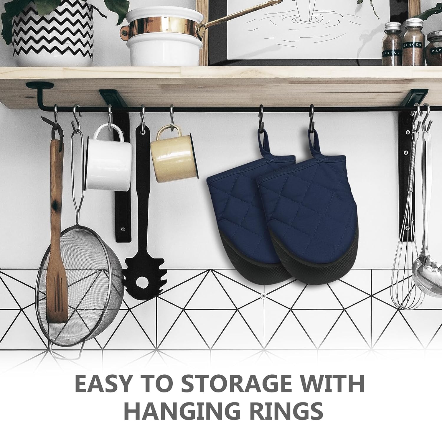 1 Pair Short Oven Mitts - Silicone Kitchen Oven Gloves High Heat Resistant 500℉, Mini Oven Mits with Non-Slip Grip Surfaces and Hanging Loop for BBQ, Baking, Cooking and Grilling (Dark Blue)