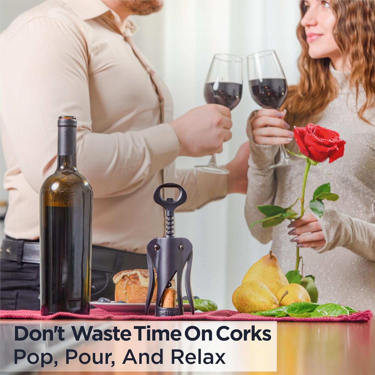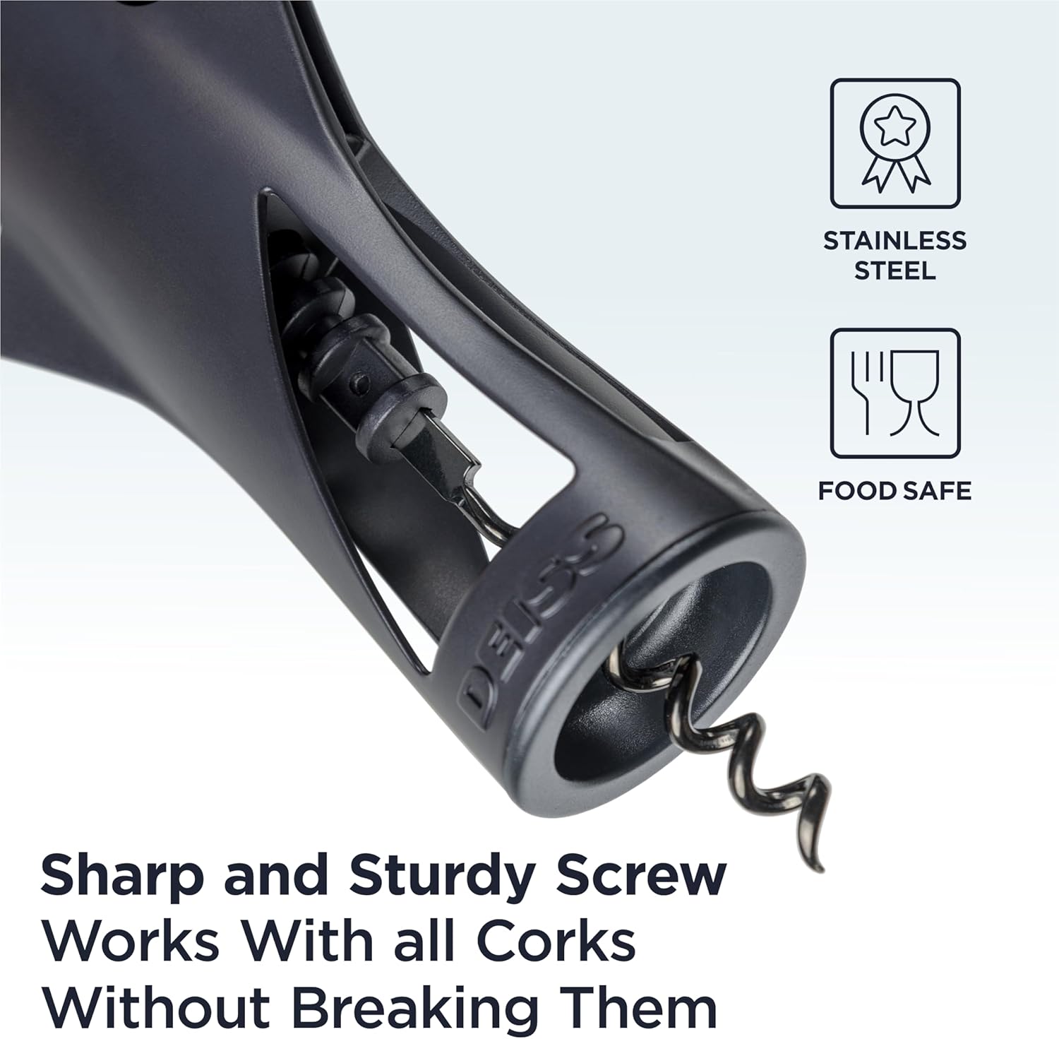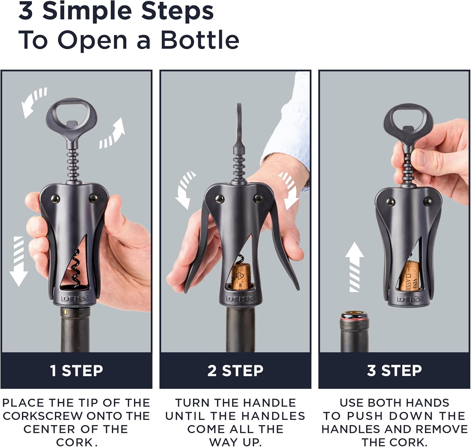 Deiss LUX Wine Opener, All-Metal Wing Corkscrew Wine Bottle Opener with Built-in Beer Bottle Opener - Ergonomic Cork Screw Wine Corker, Silver Matte Coating, Velvet Storage Pouch (BLACK)