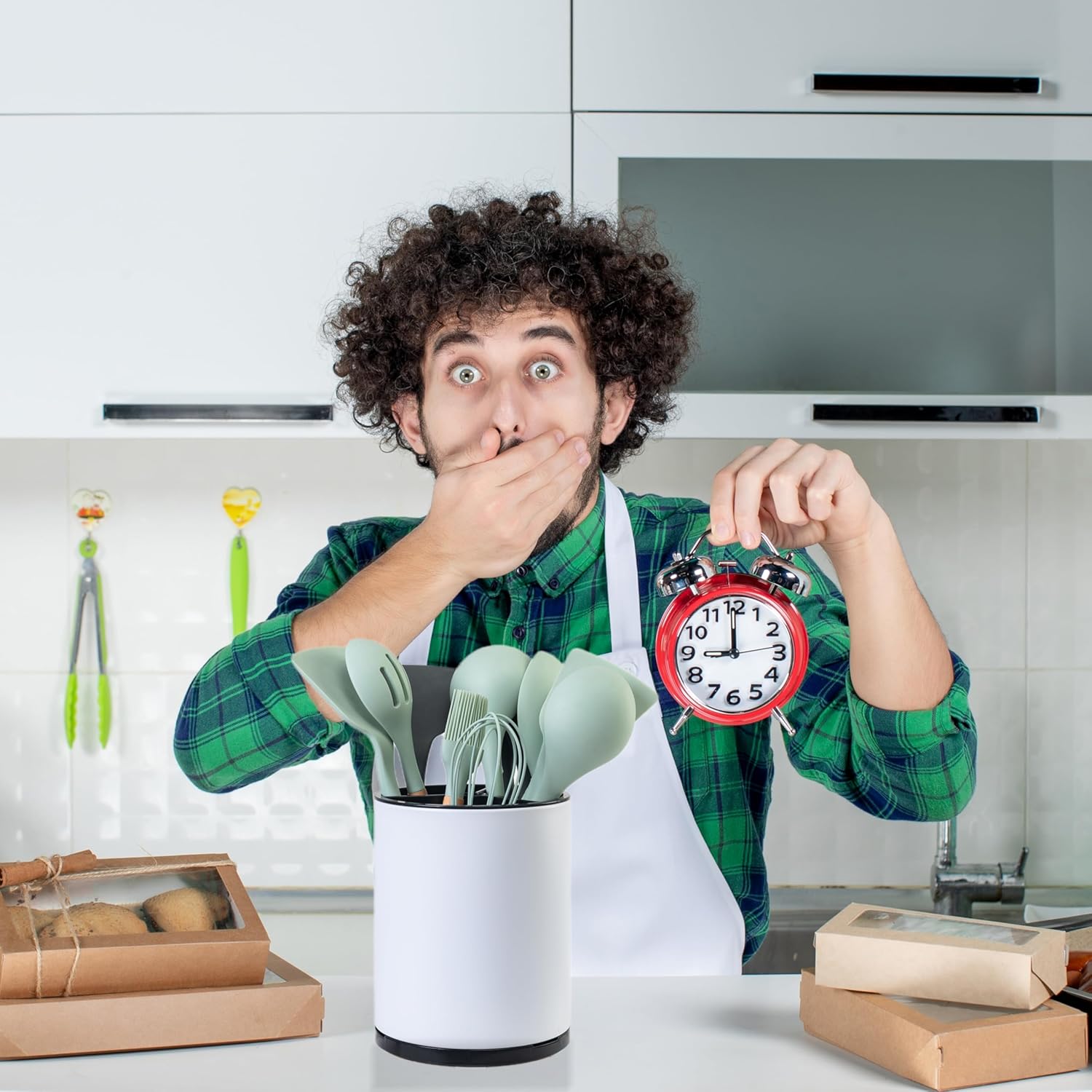 - 360° Rotating Utensil Holder: The 360° utensil caddy with rotating design makes it cooking tools are easy to use and also a great stress relieving companion in the kitchen.The large base of the utensil caddy on the kitchen countertop is equipped with 4 non-slip rubber pieces to secure utensils and prevent scratching the kitchen surface. It provides a simple and efficient storage solution for all your kitchen utensils.
