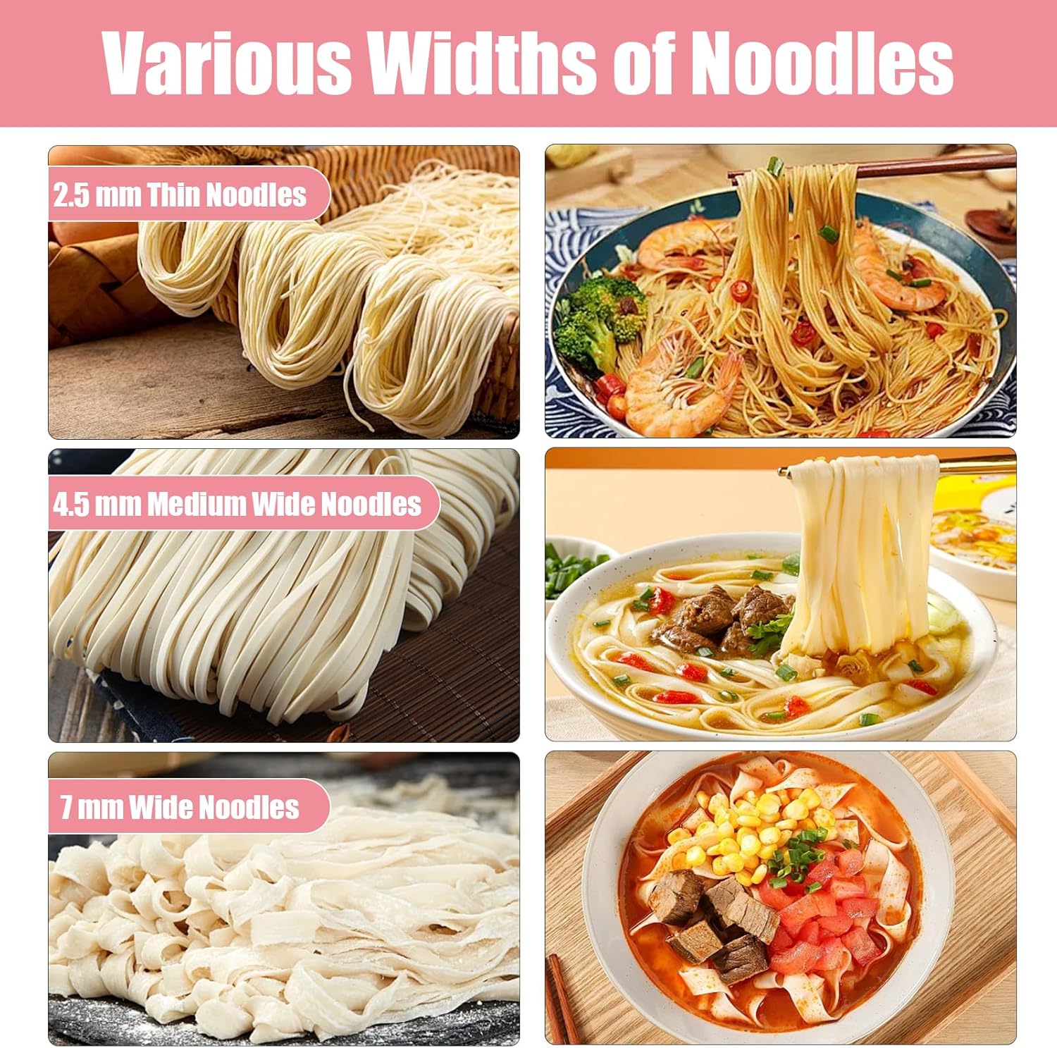 - 【Adjustable settings】It is designed with six adjustable thicknesses (0.01-0.20inch), allowing you to freely adjust by the knob for making pasta wrappers, dumpling wrappers and more. It also provides three widths of 2.4 mm, 4.5 mm, and 8 mm to choose from, which can meet your needs for making different noodles.