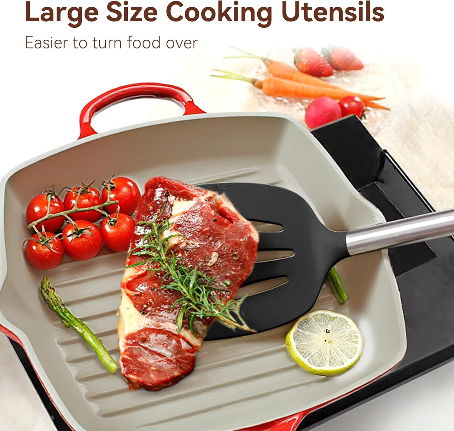 - LARGE STAINLESS STEEL HANDLES KITCHEN UTENSILS: Our kitchen utensils are designed in large sizes, not those ordinary kitchen utensils that look like toys. Silicone heads combined with high quality stainless steel handles ensure lightweight and durable. The thickened anti-scald silicone cover on the handle prevents slipping and also prevents the cook's hand from getting burned. Strong welding makes the silicone head durable and hard to come off even after long time use