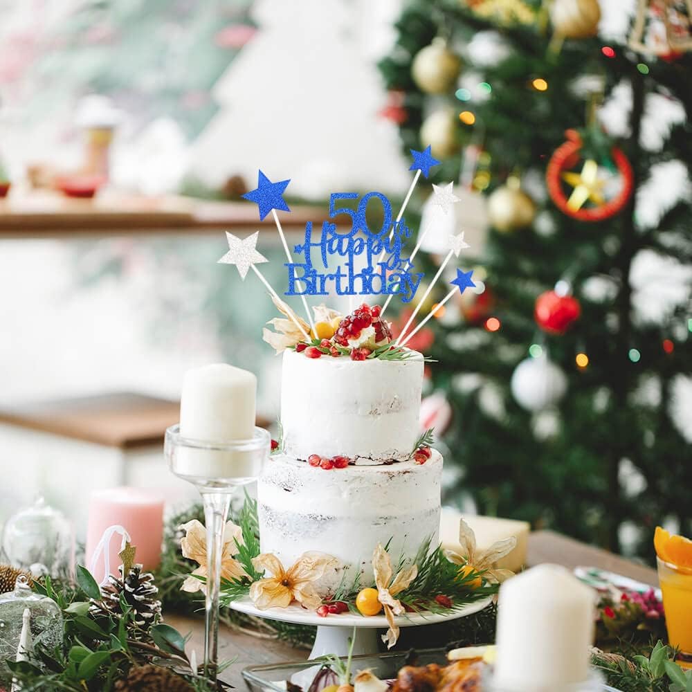 Glittery 50th Happy Birthday Cake Topper with Star,Personalised 50 Birthday Cake Toppers Party Decorations Party Supplies for Men Women Blue