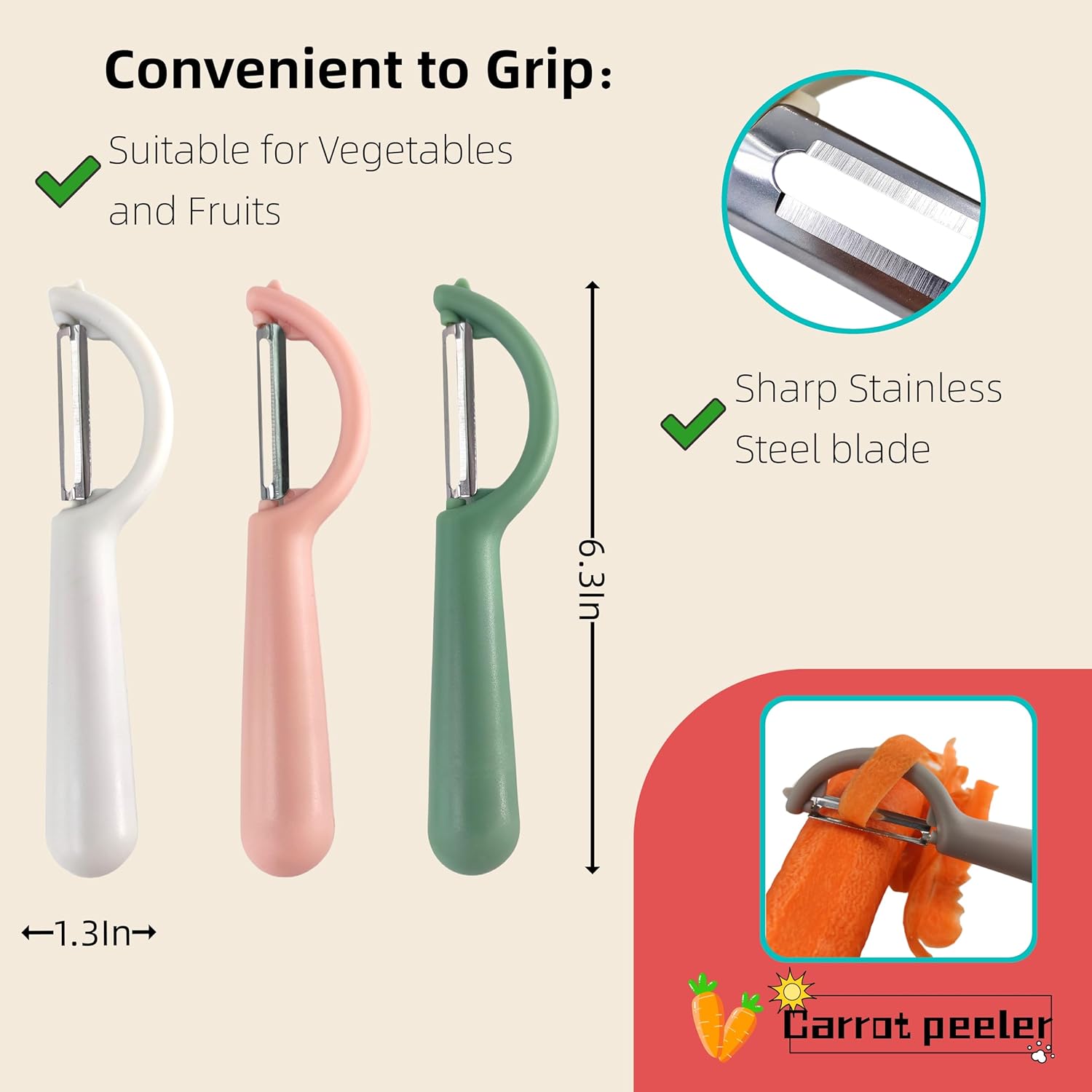 - đ„ăNon-Slip & Ergonomic DesignăThis veggie peeler has a non-slip handle and won't slip in wet conditions. The handle is large and easy to grip, efficient and lightweight, comfortable to use for both right and left hand operation, even for people with arthritis.
