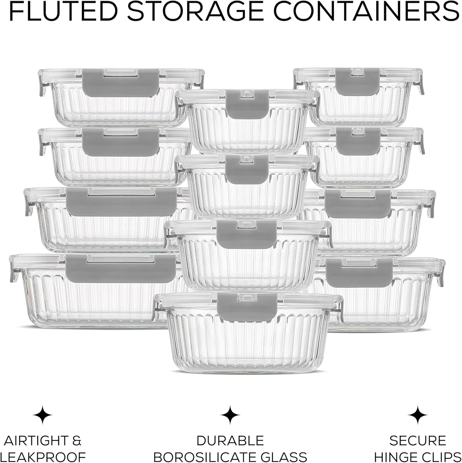 - FLUTED GLASS FOOD STORAGE CONTAINERS FOR EVERYTHING: Prep, stash, stack, store, and more with our charming, fluted glass meal prep containers! BPA-free, they go from freezer to oven without breaking. With a variety of shapes and sizes, these glass containers handle it all.