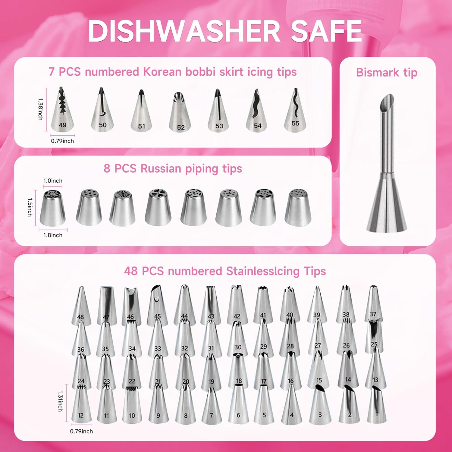 - PATTERN CHART AND E-BOOK :This cake decorating kit is FUN FOR ALL AGES AND SKILL LEVELS,This set having numbered piping tips with Pattern chart. So you don't have to worry about which tips produce what kind of decoration, just have a look on pattern chart where we have provided outcome of each tip to make tip selection,E-Book user guide includes The Cake Decorating supplies four levels,Each step Method of Cake Baking, Leveling & icing cakes, 3 frosting recipes, Step by step guide for using icing