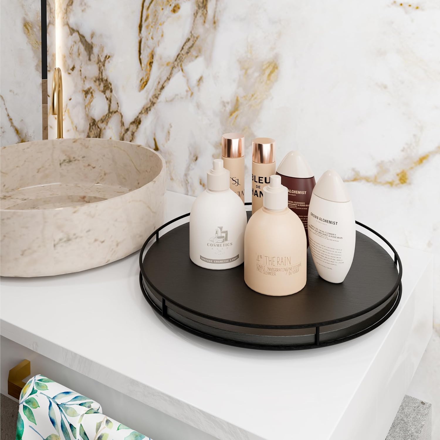 - Sturdy Steel Frame: The circular steel frame surrounding the lazy Susan stands at a substantial 1.6 inches in height. This thoughtful design controls items from accidentally sliding or falling off, providing an extra layer of security and making it suitable for both regular use and special occasions.