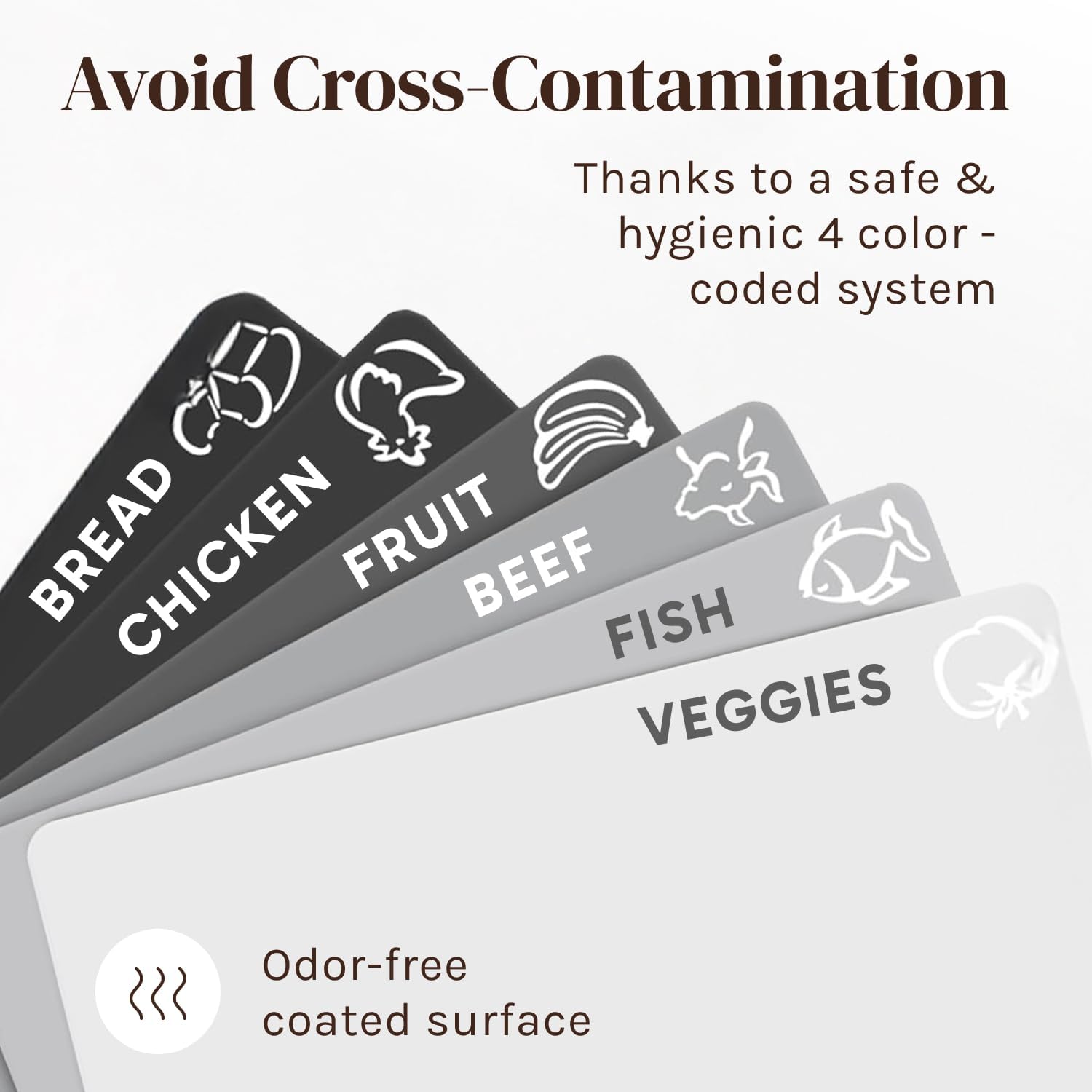 - NON-POROUS ODOR RESISTANT COATING - Naturally nonstick - The color-coded set prevents unwanted transfer of organisms from one substance to another for you & your family's safety.