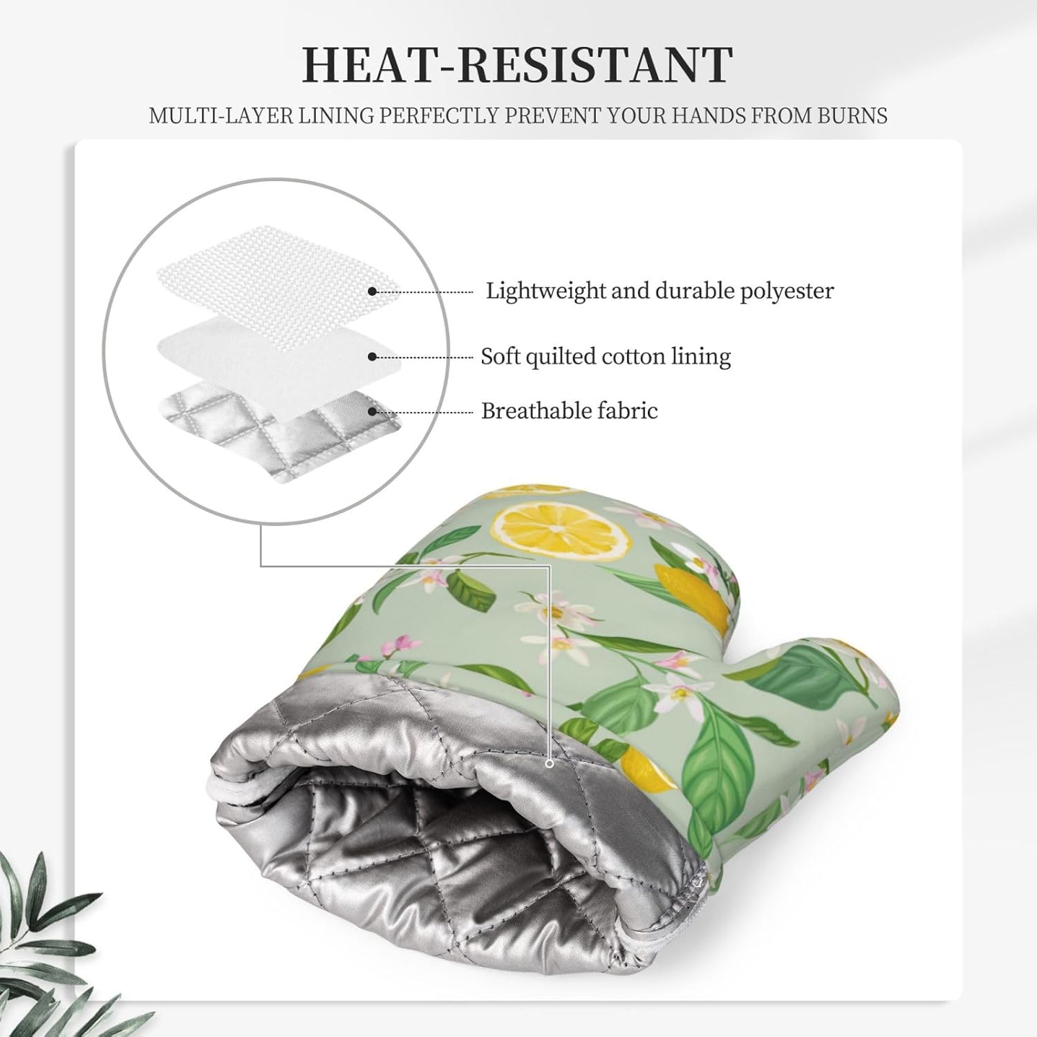 - HEAT RESISTANT: Silicone kitchen oven mitts offer maximum protection from high temperatures of up to 392 F/ 200 C. Compared to traditional cotton oven mitts, our yellow lemon silicone oven gloves are better insulated. The extra long oven mitts (11 X 7.2 inches) protect your wrist and part of your arm. Ideal for use on barbecues, BBQ, cooking, baking, grills, microwaves and ovens.