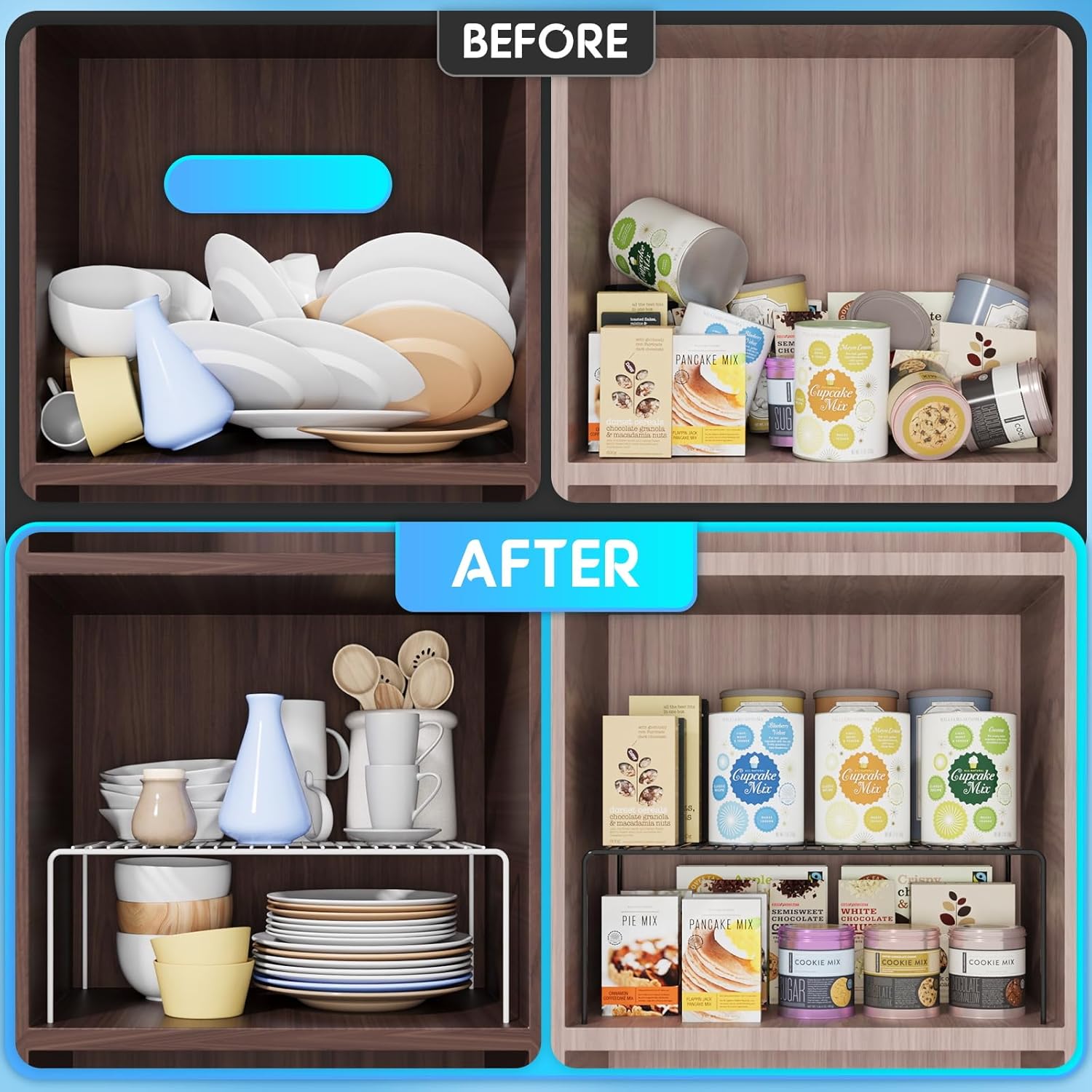 - Space Saver Help Shelves: This set of 2 helper shelves will double your space! Perfect for keeping everything organized in kitchen cupboards, pantries, bathroom cabinets, closets, counter tops, under the sink, or anywhere you need extra room