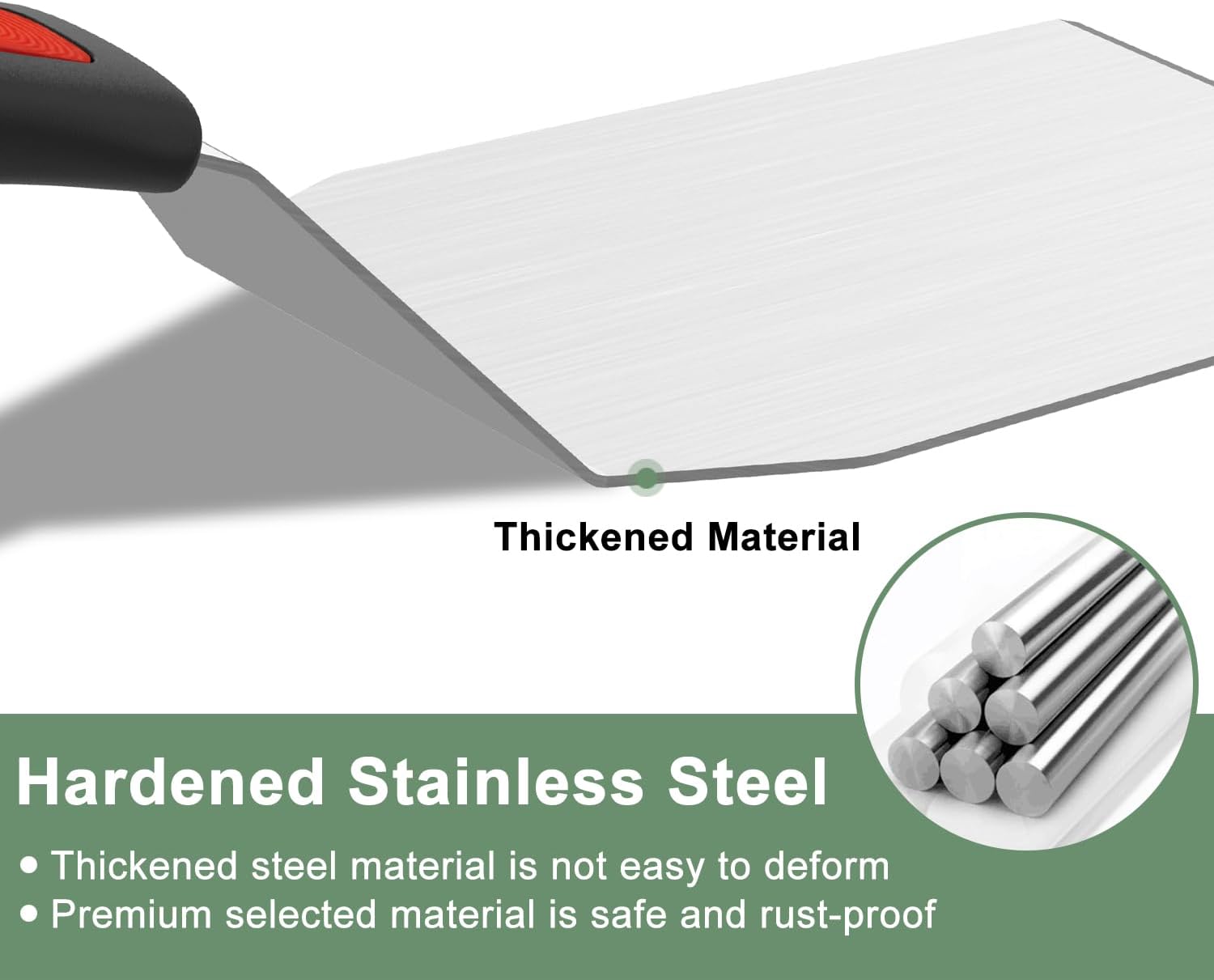 - Hardened Stainless Steel: This commercial grade spatula stainless steel is hardened, sturdy steel blade eliminates flex for smash burgers and tough scraping tasks