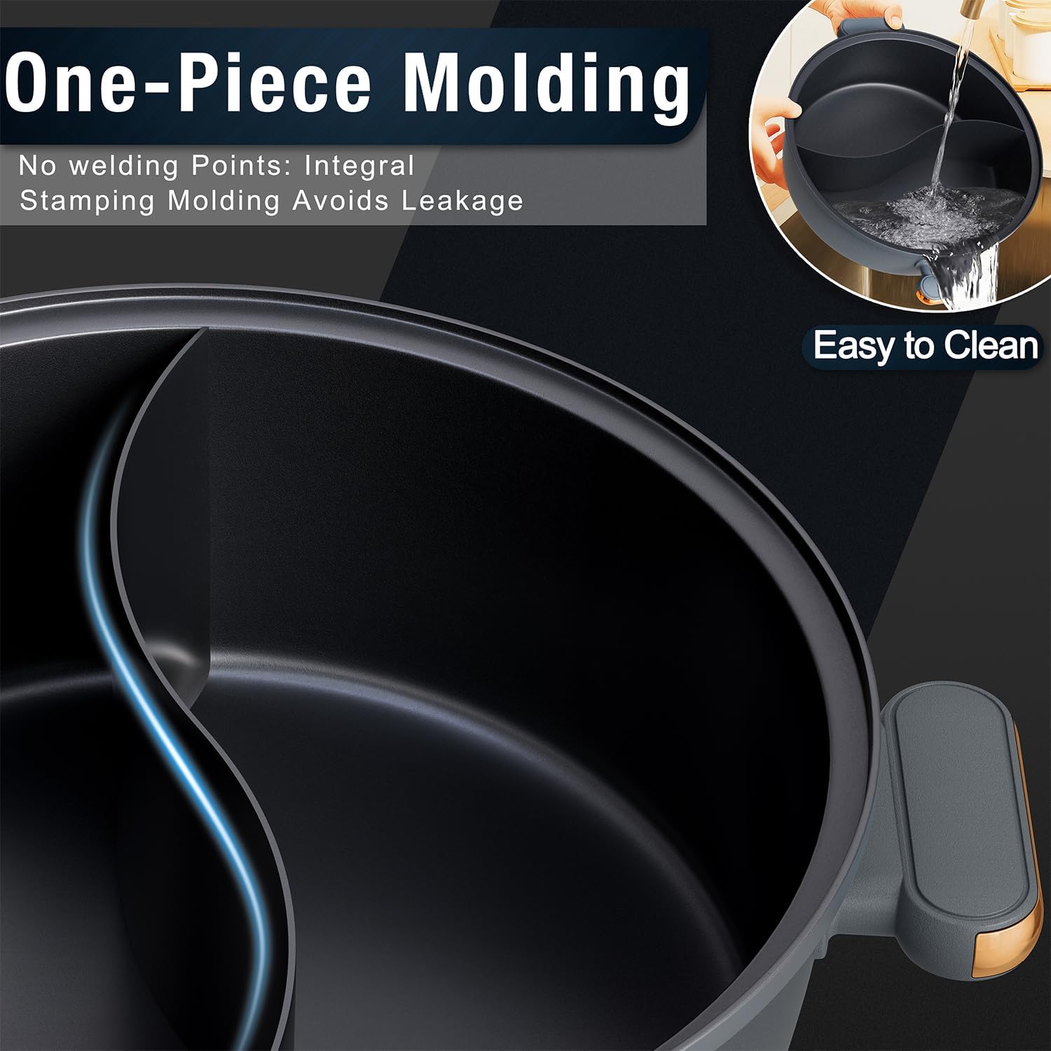- Enjoy Dual Flavors in One Pot - This hot pot with divider is 100% PFOA-free. The dual flavor electric pot is designed with seamless, weld-free construction. the s-shaped divider is designed to prevent spills and odors while allowing you to enjoy two flavors in one pot at the same time. This unique feature transforms your cooking experience, making it easy to enjoy a variety of soups in our electric shabu shabu pot.