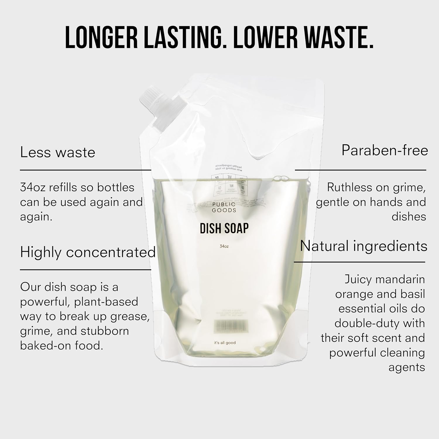 Public Goods Natural Dish Soap | Kitchen Soap | Plant-Based & Vegan Friendly | Clear Dish Detergent Liquid | Concentrated | Made in USA | Mandarin Basil | 34 Fl Oz Refill