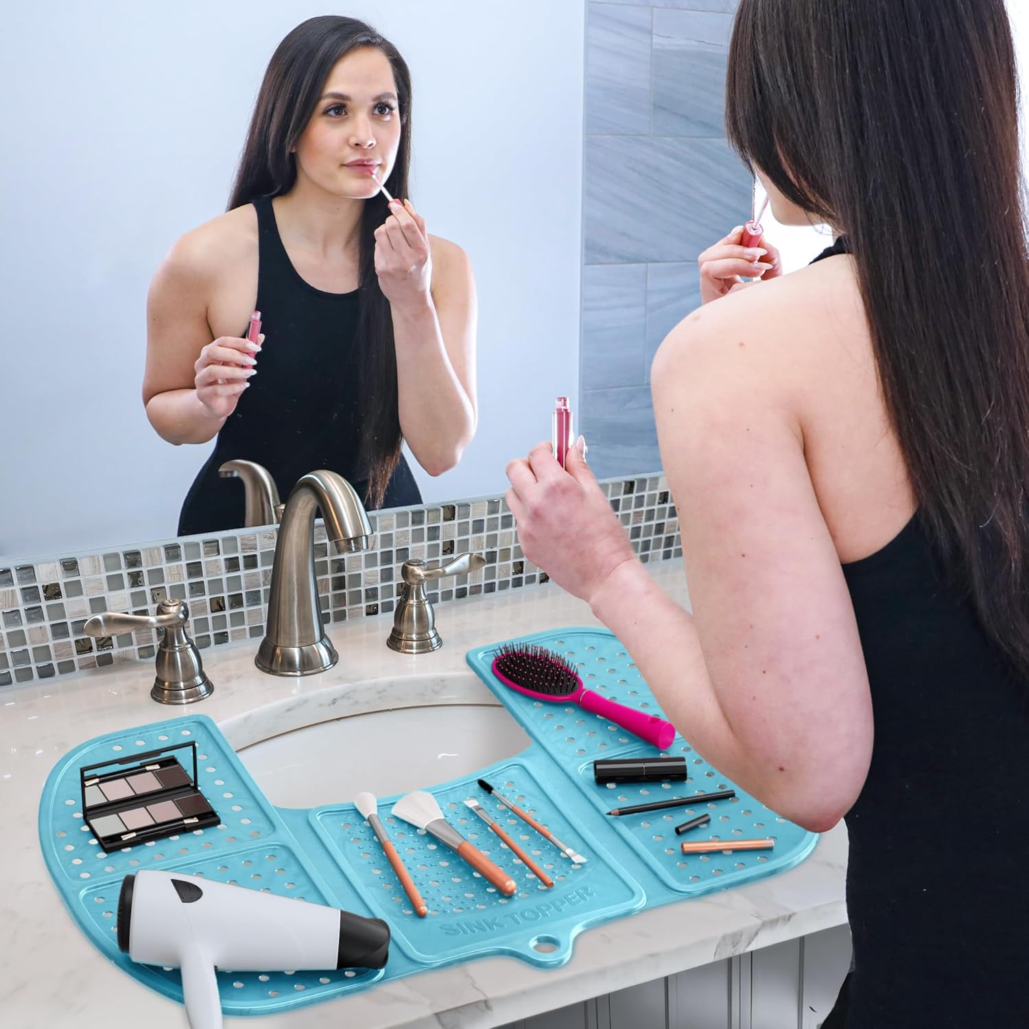 Sink Topper Bathroom Counter Cover & Storage Saver, Foldable Silicone Mat for Hot Tools, Hair Styling & Makeup, Beauty Brush Cleaning Mat, RV Camper Sink Cover & for Small Spaces (Large Pacific Blue)