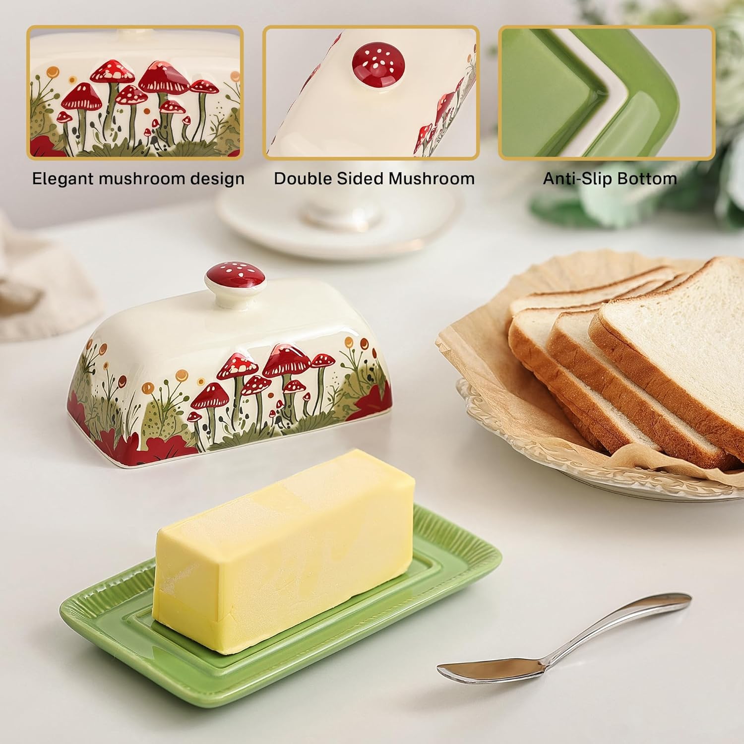 - Kitchen Beautifier: Elevate your kitchen decor with this eye-catching butter dish. Its vibrant, mushroom-themed design harmonizes beautifully with other kitchenware, making it an ideal centerpiece for any countertop or dining table.