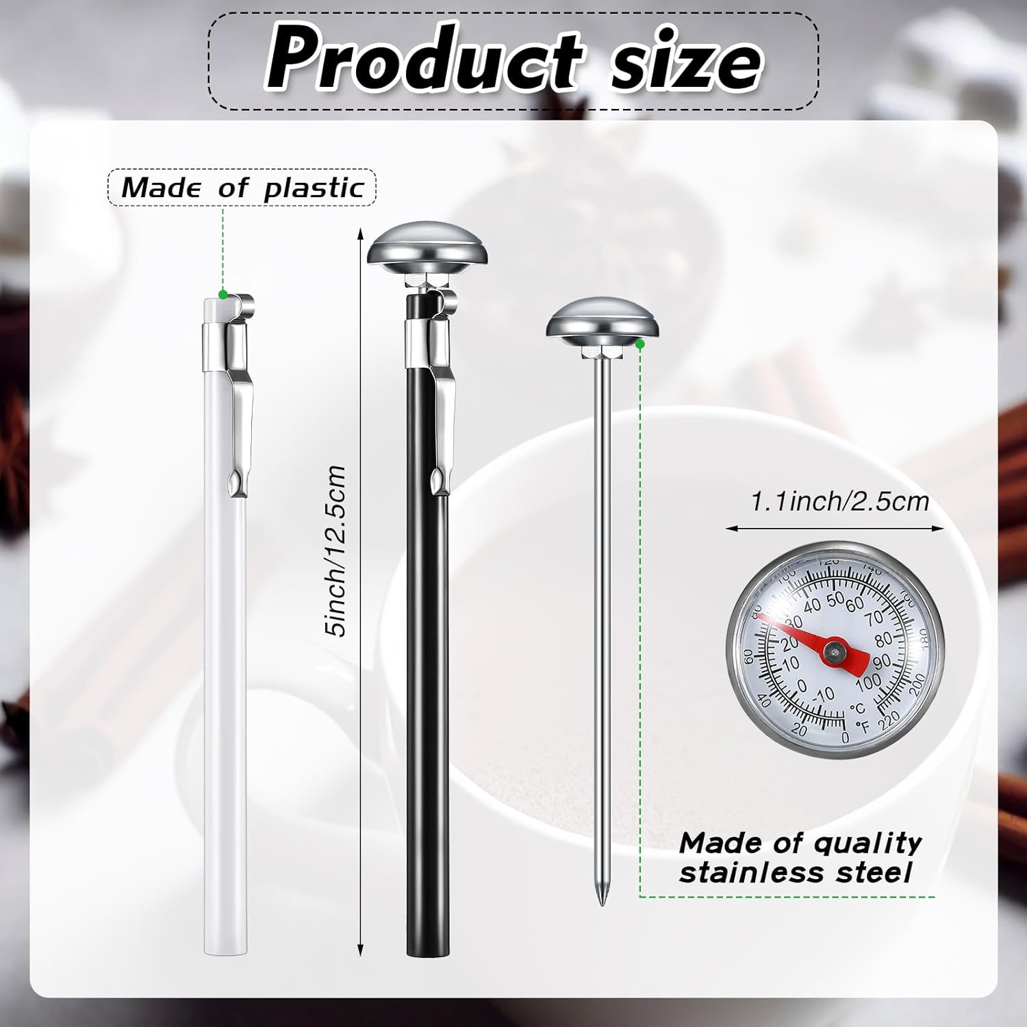 - Size Information: the dial is about 1 inches/ 2.5 cm in diameter, and this long stem is about 5 inches/ 12.5 cm in length, compact and proper, you can use this water thermometer to measure a lot of liquid, handy and comfortable, to bring you a nice feeling