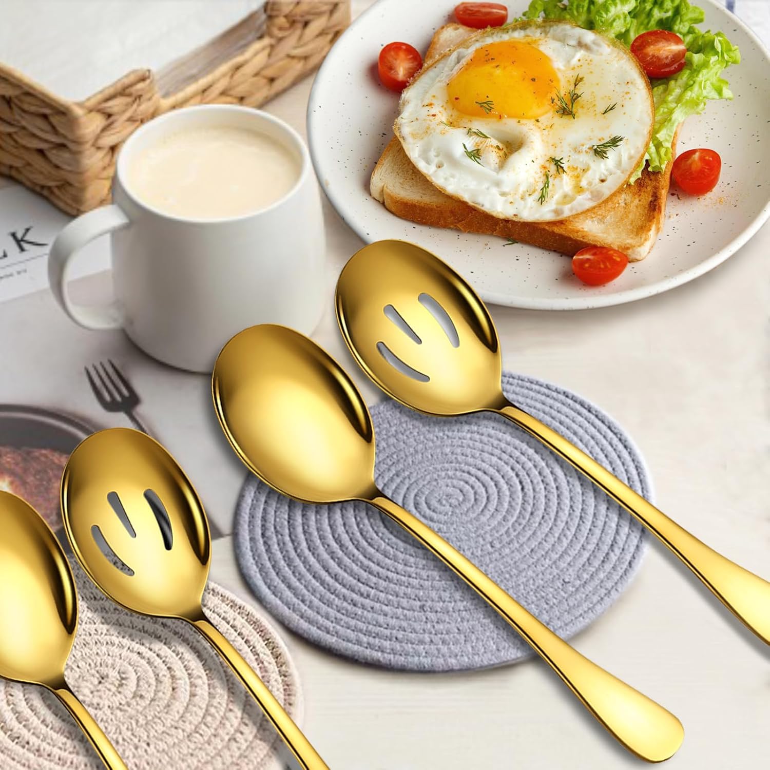 Gold Large Serving Spoons, 8 Pieces Large Stainless Steel Serving Spoons Set Includes 4 Large Serving Spoon,4 Large Slotted Spoons. Serving Spoons for Parties/Buffet, Dishwasher Safe, 10-Inch