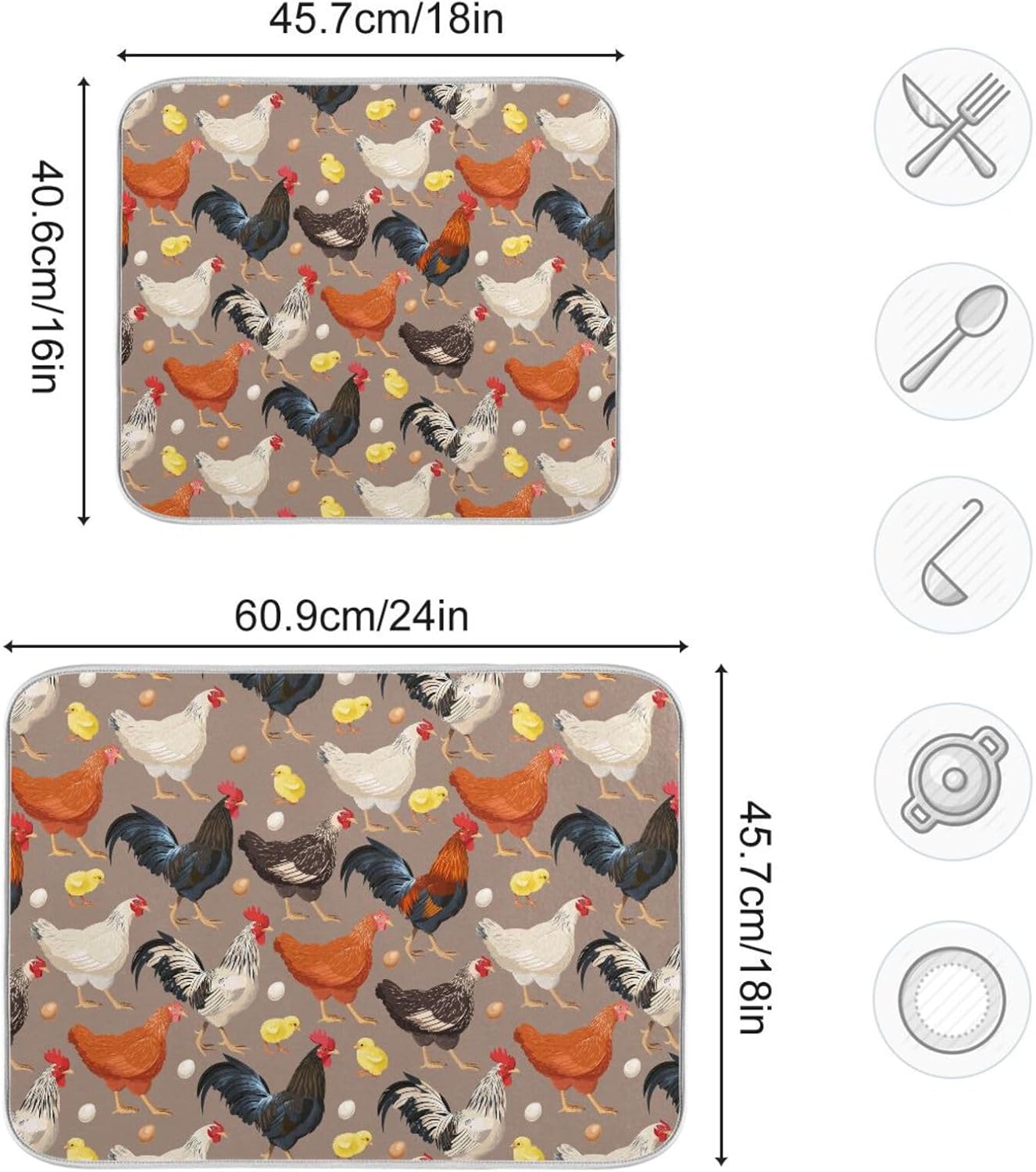 Hens Roosters Chicken Dish Drying Mat for Kitchen Counter Absorbent Microfiber Drying Pad, Medium 16x18 in, Reversible Drainer Mats
