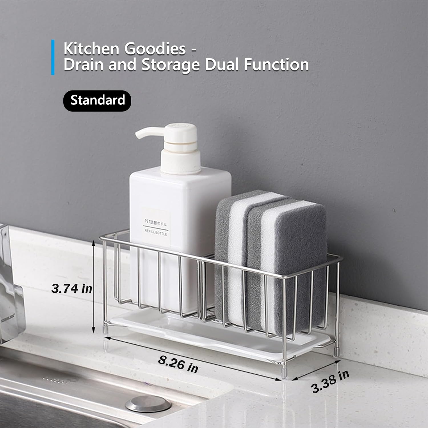 - 【Divider Design & Drip Tray】The partition board can be used in the kitchen sink storage rack to divide it into two independent storage spaces, which can be used to place different items respectively, making the countertop look efficient, tidy and beautiful. The dividers are also made of stainless steel and are durable. The kitchen soap rack comes with a removable drip tray to catch dripping water from the rack and prevent it from getting wet on the countertop.