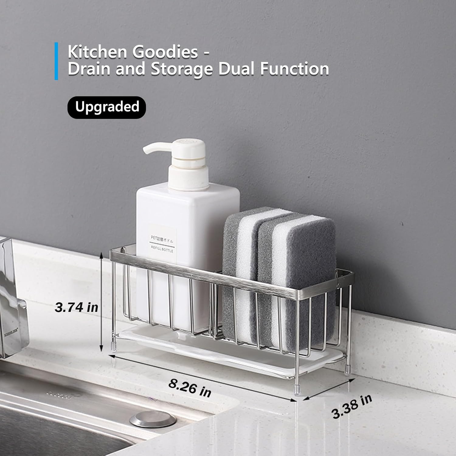 - 【Divider Design & Drip Tray】The partition board can be used in the kitchen sink storage rack to divide it into two independent storage spaces, which can be used to place different items respectively, making the countertop look efficient, tidy and beautiful. The dividers are also made of stainless steel and are durable. The kitchen soap rack comes with a removable drip tray to catch dripping water from the rack and prevent it from getting wet on the countertop.