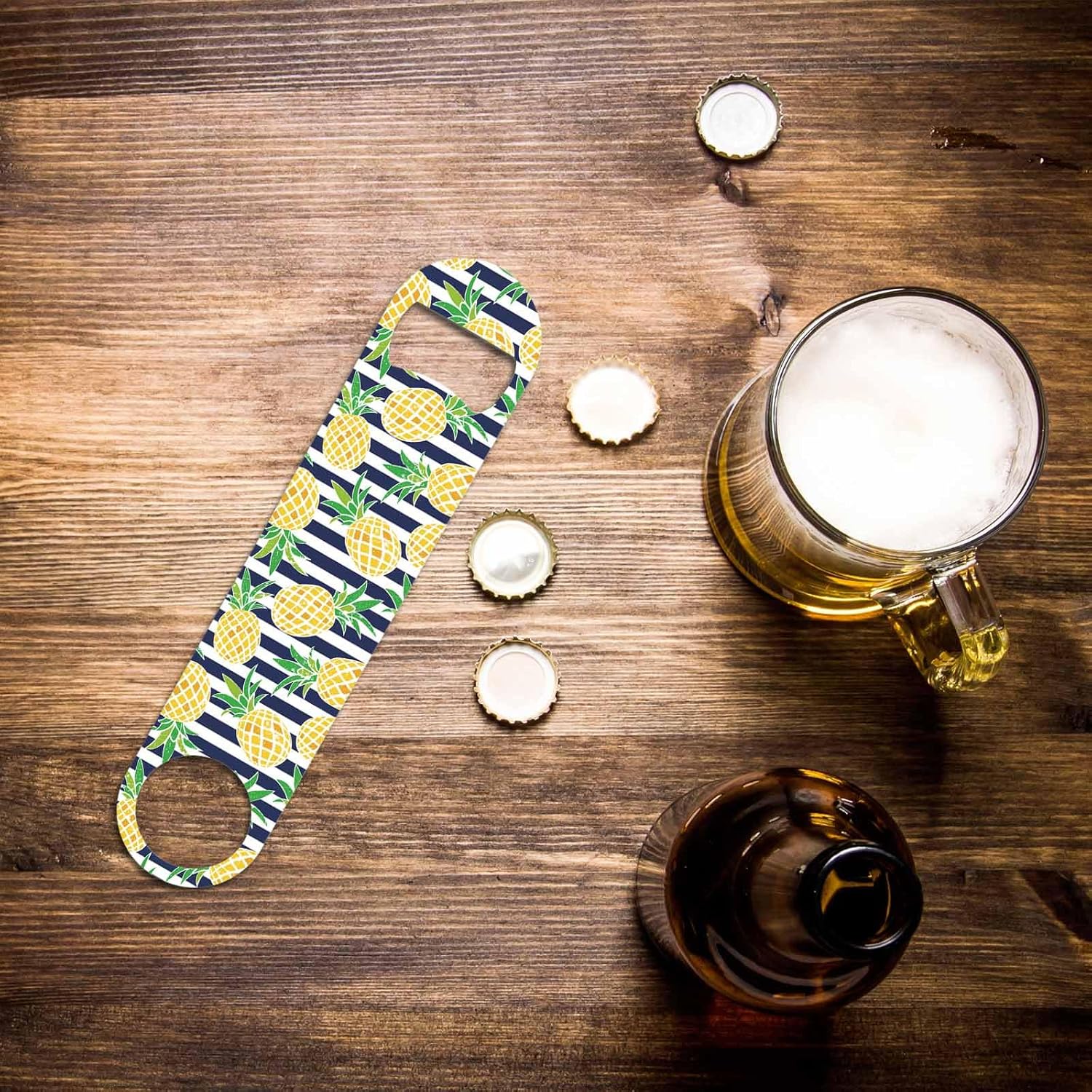 Pineapple Stainless Steel Bottle Opener Summer Beach Pineapple Stripes Blue Yellow Green Flat Beer Bottle Opener Keychain for Home Kitchen Bar Restaurant Party Birthday Gift
