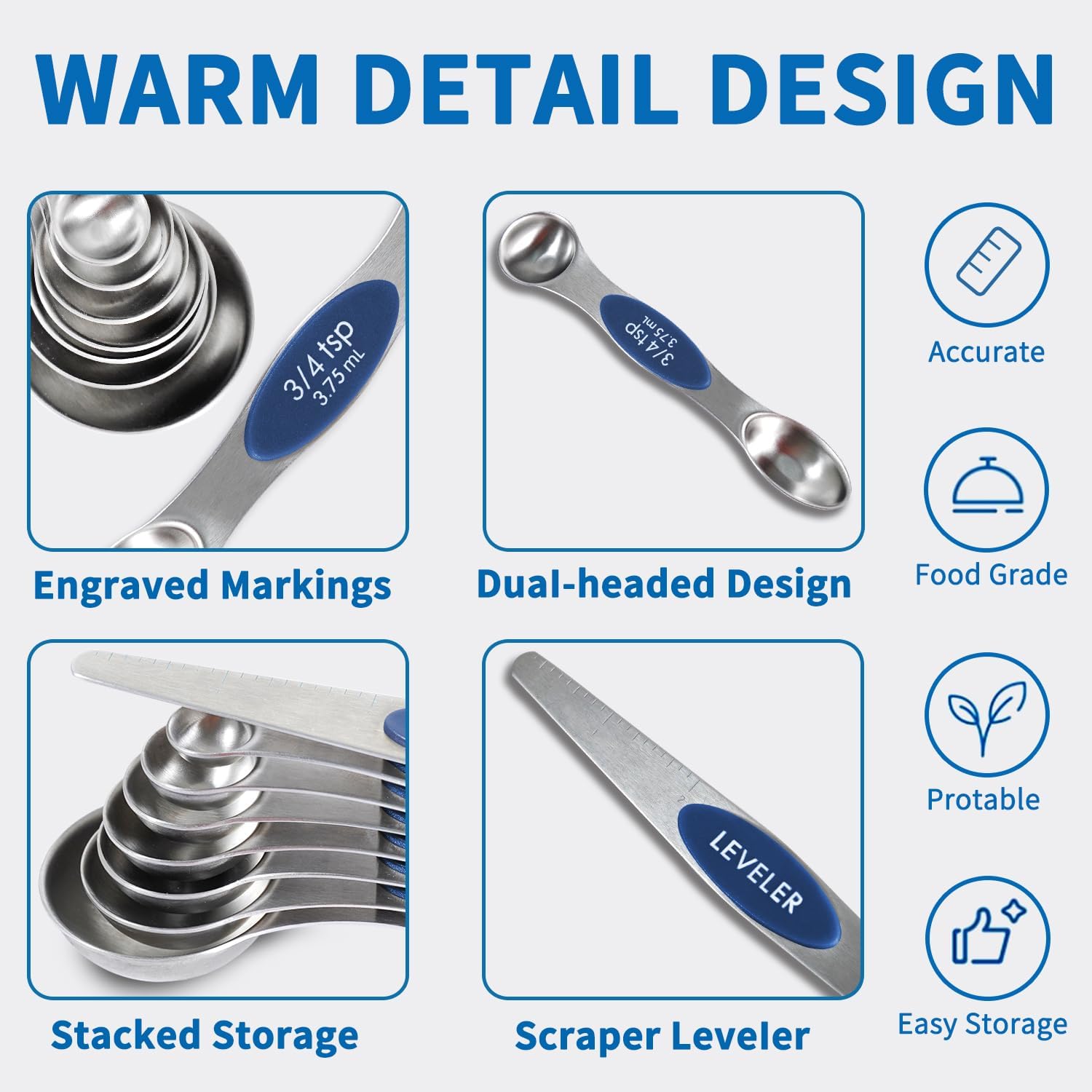 - 【Convenient Storage】Unique stackable design makes cups nest together easier, and each piece of stainless steel measuring teaspoon has an enhanced magnetic center for easy stacking together, to save kitchen space and reduce clutter, making your kitchen look neat and elegant.