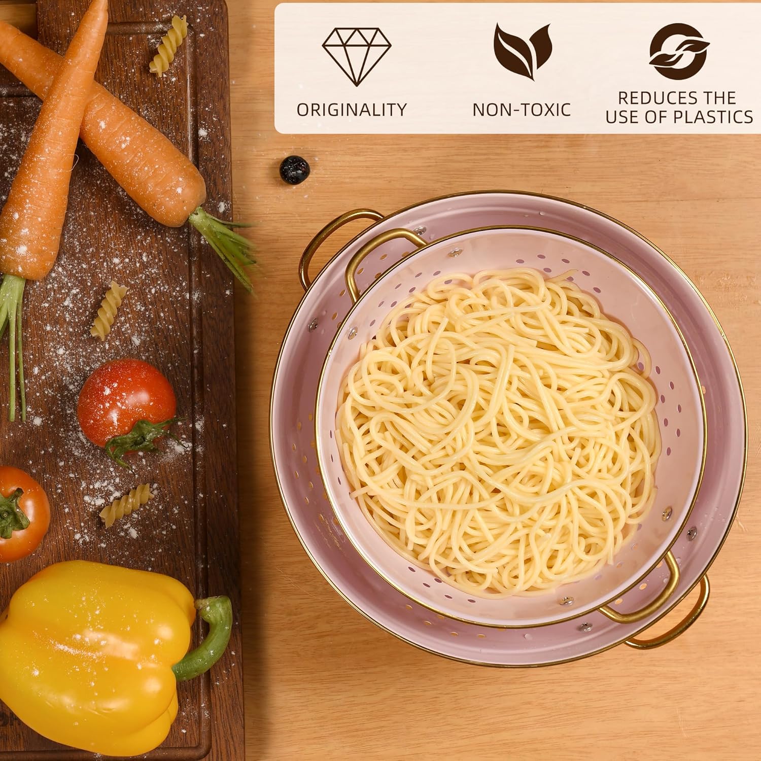 Metal Colander Set of 2, Strainer Basket with Handles 3.5 & 5 Qt Powder Coated Self-draining Solid Ring Base Metal Large Kitchen Colander Bowel for Pasta Vegetable Fruit (PINK), 2pack