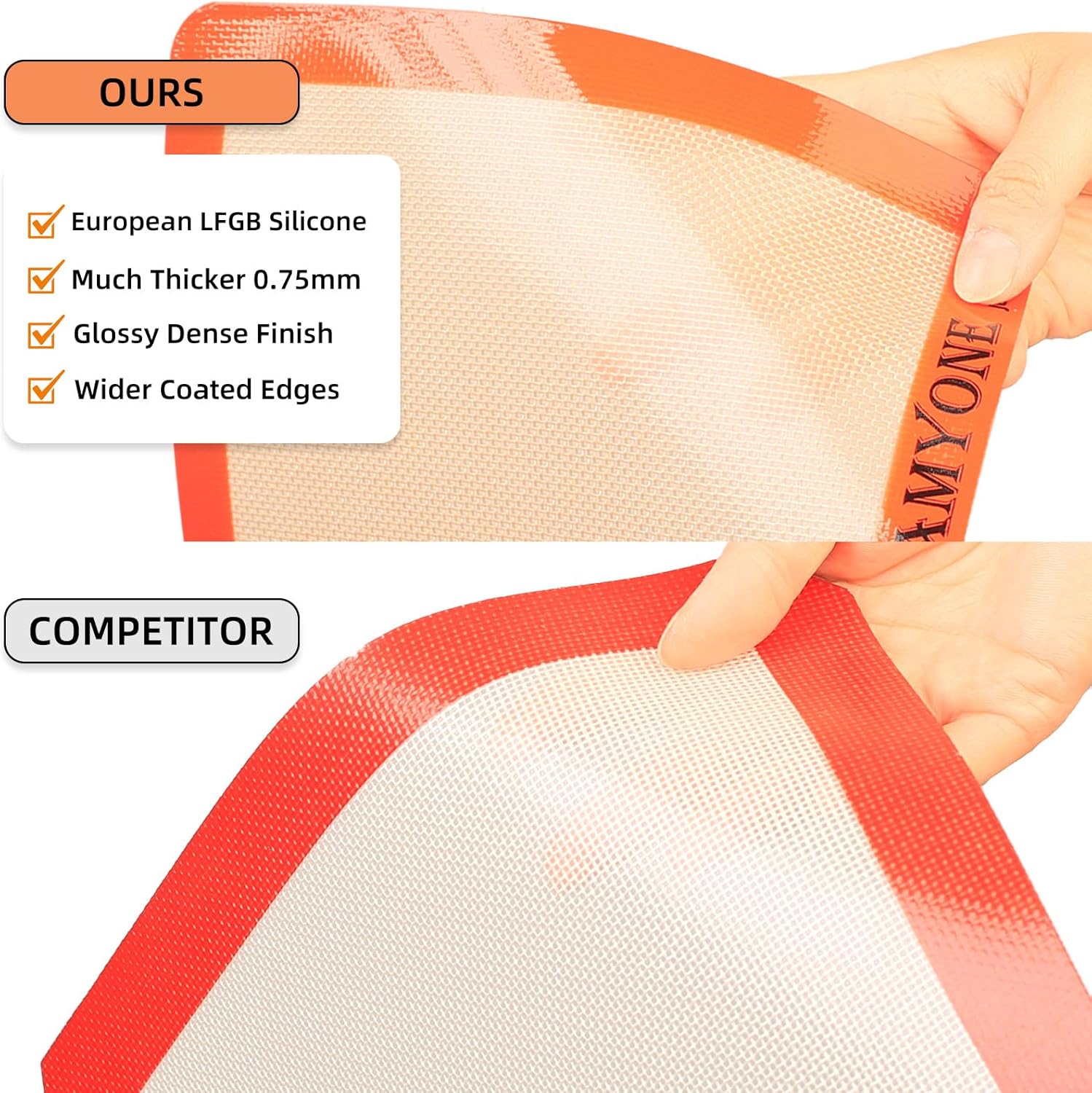 - đ§ăTOP-QUALITY CONSTRUCTIONăCrafted from premium food-grade silicone and internally reinforced with fiberglass, this 2/3 silicone baking mat is built to last. It meets European standard, guaranteeing reliable performance for all your baking needs. With a thickness of 0.75mm and with glossy dense finish as well as wider coated edges, these baking mats for two thirds sheets, can withstand temperatures ranging from -40°F to 480°F making it suitable for a wide range of baking needs.