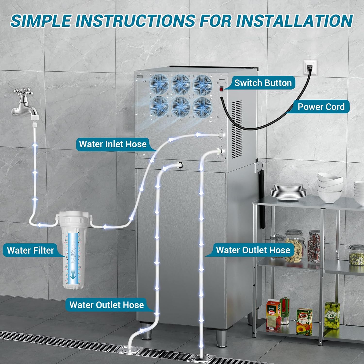 - High Ice Production Capacity & Ample Ice Storage Capacity - The commercial ice machine has a remarkable production capacity of 500lbs of ice per 24-hour cycle, and with its impressive 350lbs ice storage bucket, ensuring an abundant supply of ice for your business needs.