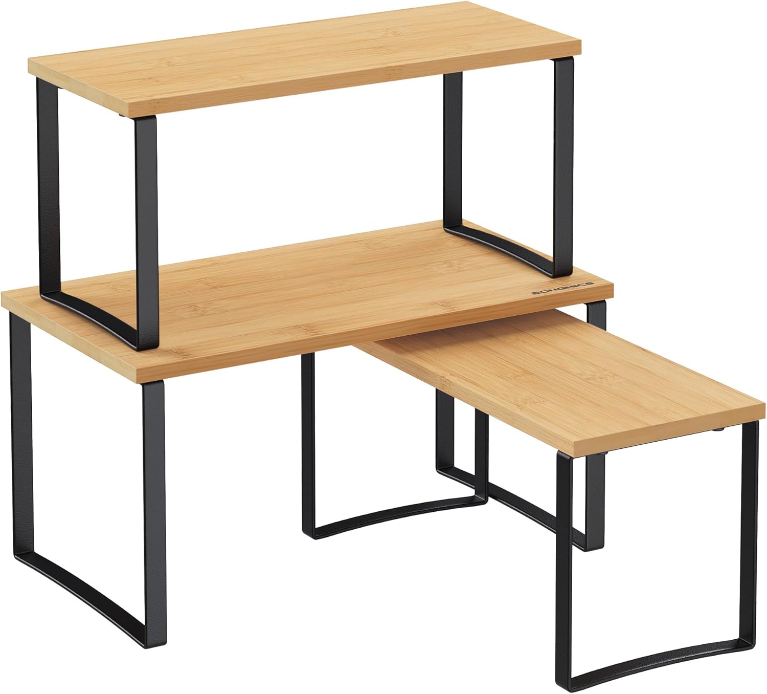 SONGMICS Cabinet Organizer Shelf, Set of 3 Kitchen Counter Shelves, Kitchen Storage, Spice Rack, Stackable, Expandable, Ink Black and Natural Beige UKCS014B01