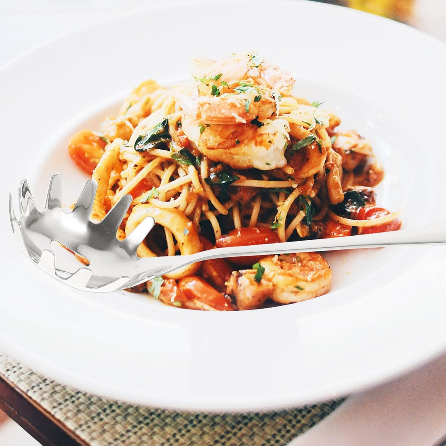 - Spaghetti fork with a long comfortable handle that will not bend, melt, or deform;
