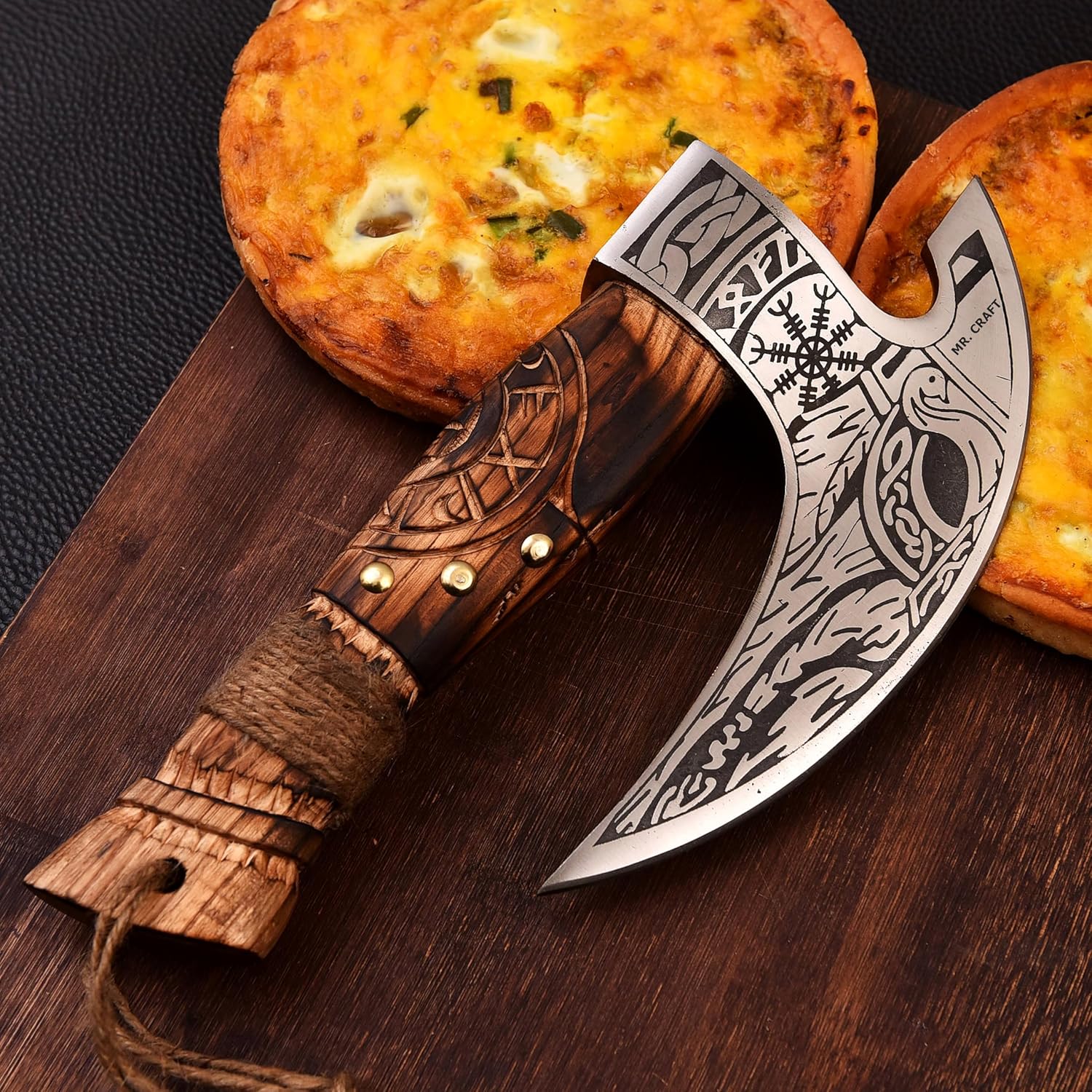 MR. CRAFT Pizza Cutter Axe Carbon Steel Slicer Chef Viking Axe with Leather Cover - Premium Pizza Oven Accessories Ulu Rocking Pizza Gifts for Men (Engraved Ash Wood)