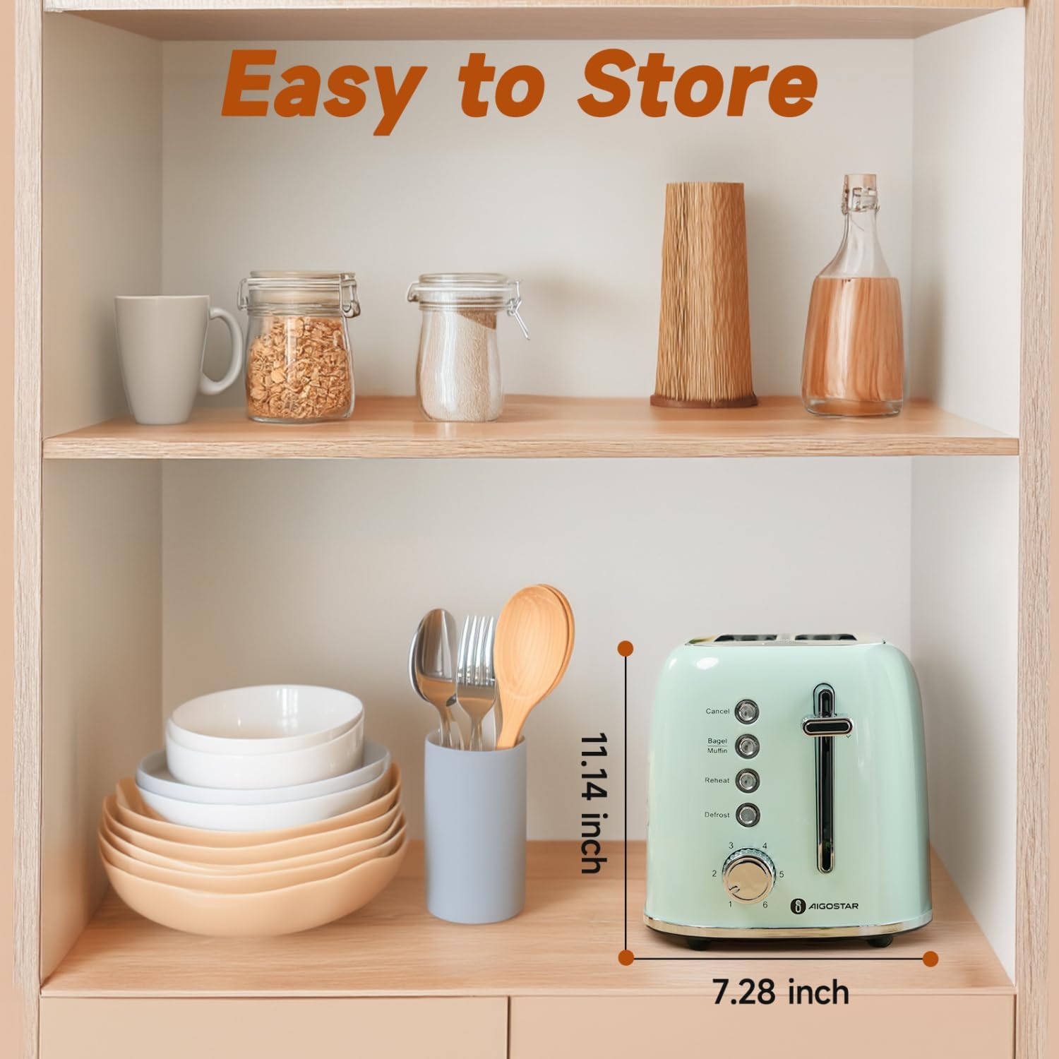 Aigostar Toaster 2 Slice Retro Toaster Stainless Steel, 1.6 inch Extra Wide Slots Bread Toaster Bagel, Cancel, Defrost Function, 6 Shade Settings & Removable Crumb Tray for Bread Waffle, Aqua Green