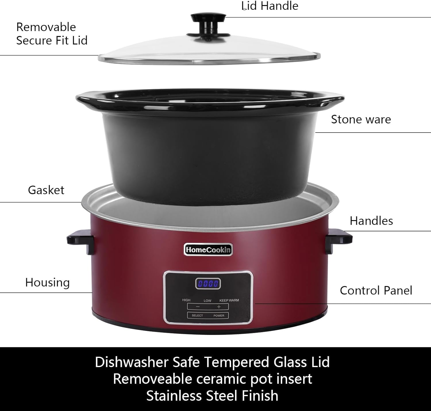 HOMECOOKIN 8 Quart Programmable Slow Cooker, Kitchen Appliances, Perfect Kitchen Small Appliance for Family Dinners, Red Stainless Steel