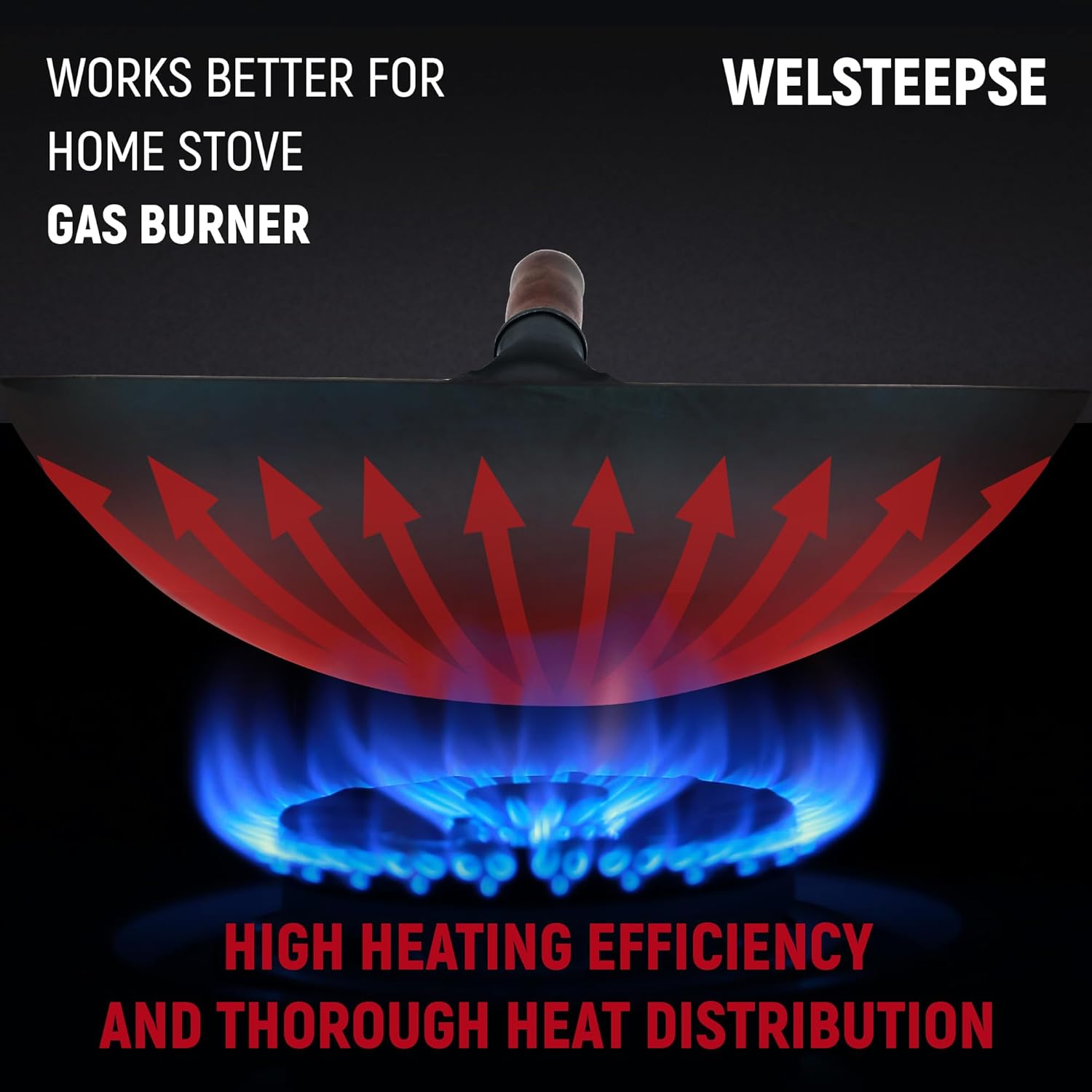 - Hand Hammered: The process of hand hammering the wok creates a unique texture on the surface of the pan, which not only adds aesthetic value but also enhances the non-stick properties of the pan.
