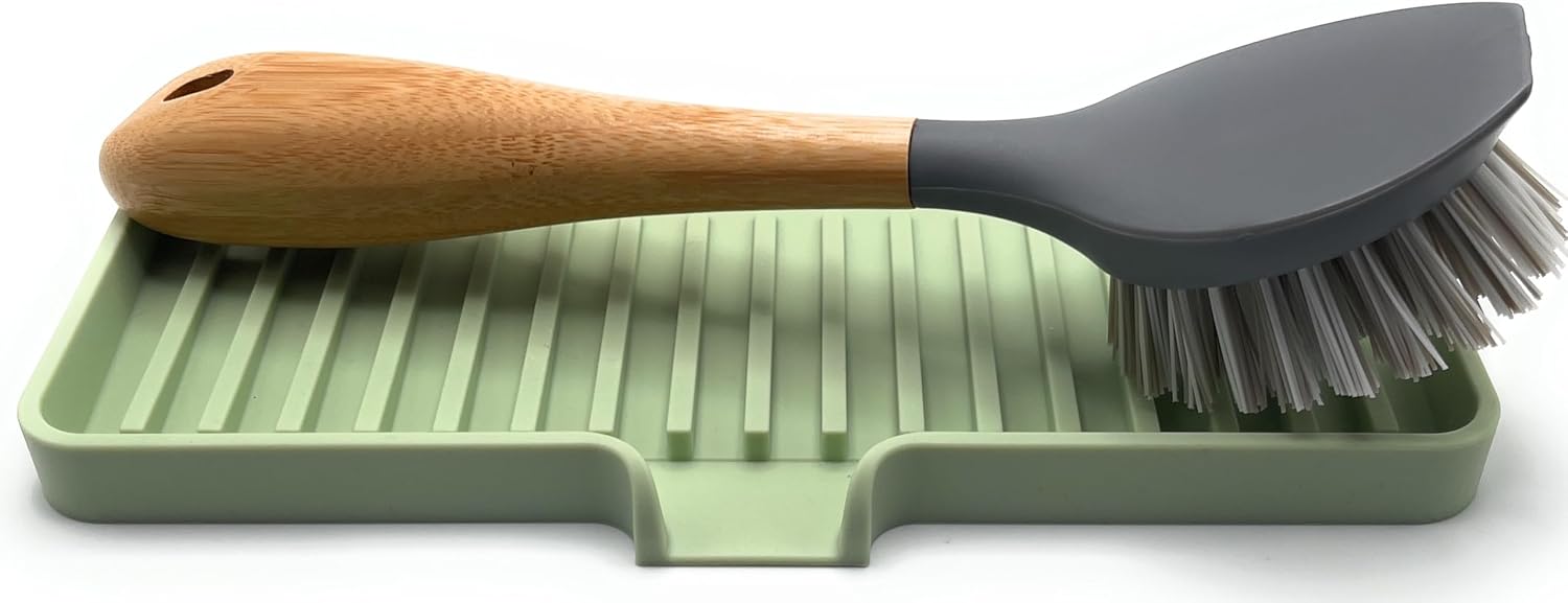 Happitasa Silicone Soap Dish Tray and Sponge Holder with Drain Chute | Bathroom and Kitchen Sink Organizer Caddy (Pistachio, 9"x3.5", 5.6 Ounces)