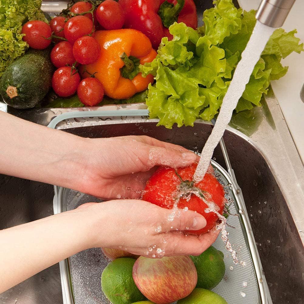 - Perfect for rinsing fruits or vegetables, fine mesh sifting basket makes this strainer a perfect tool when straining hot pasta, rice, grains, strain thick or thin wet ingredients like sauces, lumpy gravy and soups.