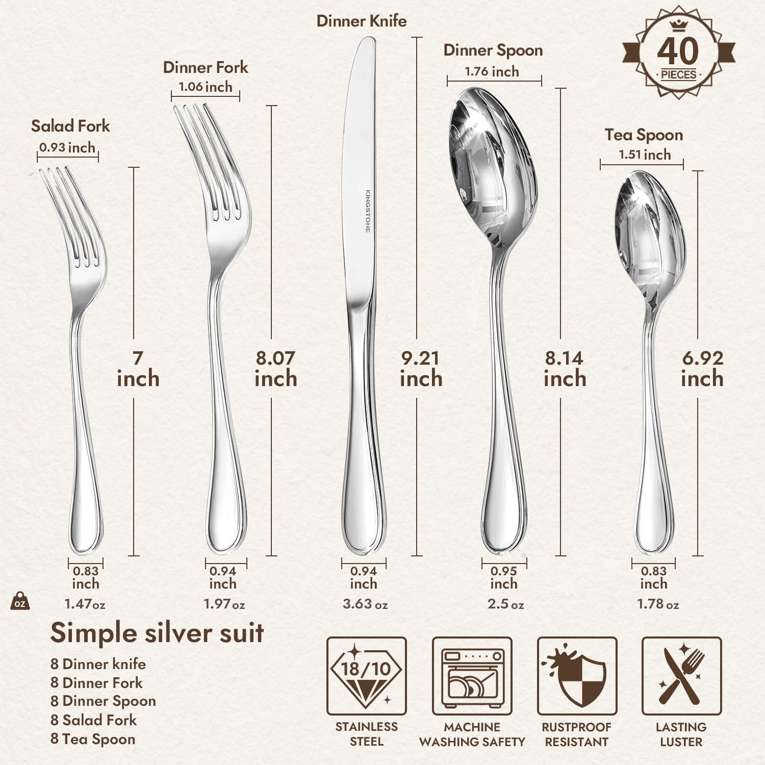 - Silverware set for 8: 40-piece silverware set includes 8 dinner forks(7 inch), 8 salad forks(8.07 inch), 8 dinner knives(9.21 inch), 8 dinner spoons(8.14 inch) and 8 teaspoons(6.92 inch), which can be used for 8 people